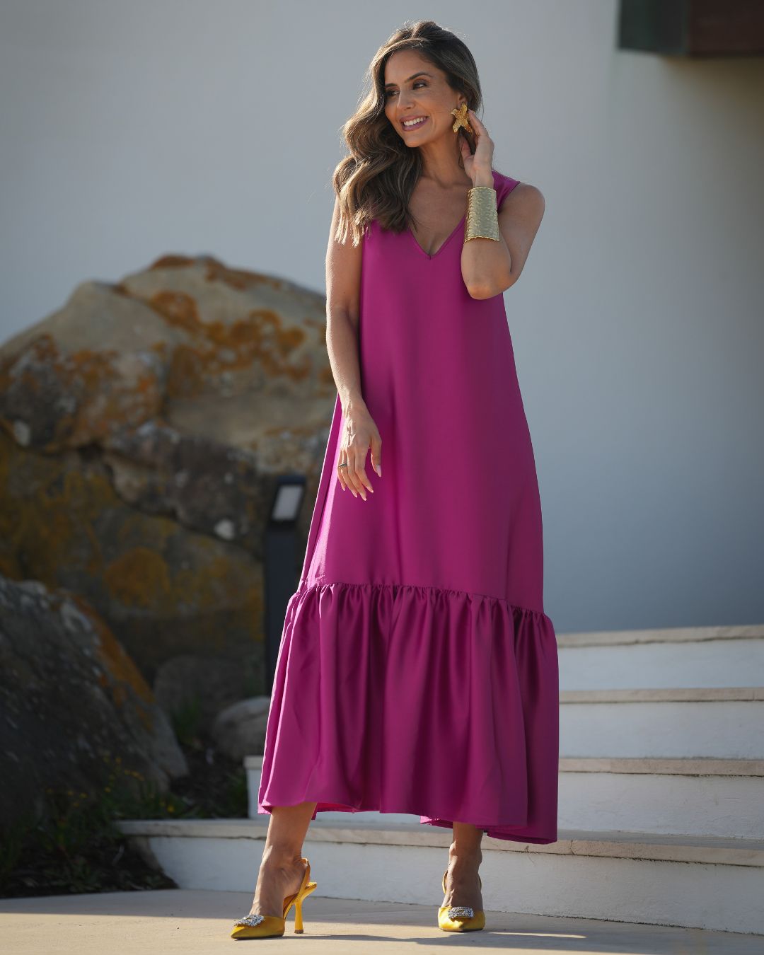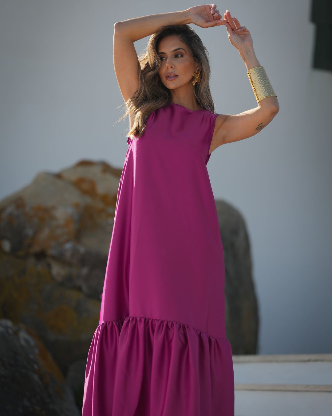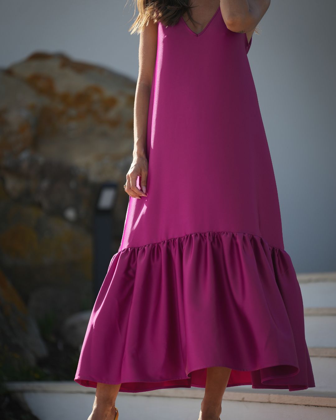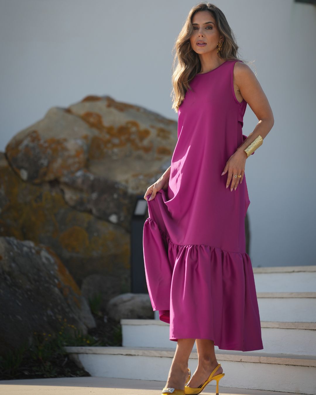 4 metros de um vestido com folho, com decote em bico nas costas mas que também pode usar na frente, com cinto que pode ser usado com laço atrás, ou cruz na frente, são várias as formas que o pode usar. O vestido que pode levar para uma cerimónia ou para ir jantar fora, basta mudar o calçado e os acessórios e voilá