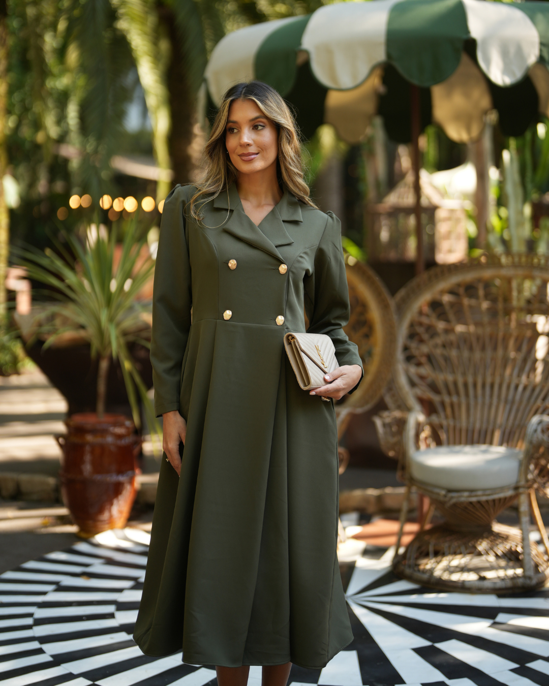 Vestido Midi & Casaco numa só peça, com botões premium que permitem desabotoar. Perfeito também para quem está a amamentar. Saia em godé com bolsos invisíveis. Todo forrado em tecido à cor. Ombreias internas para um caimento perfeito. Mangas franzidas nos ombros para efeito abalonado. Entretelado para melhor estrutura.