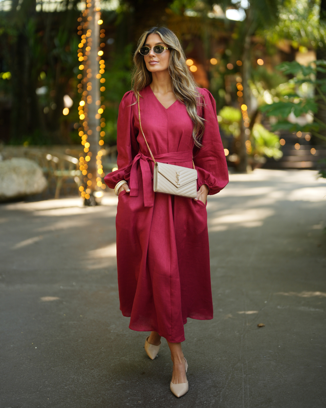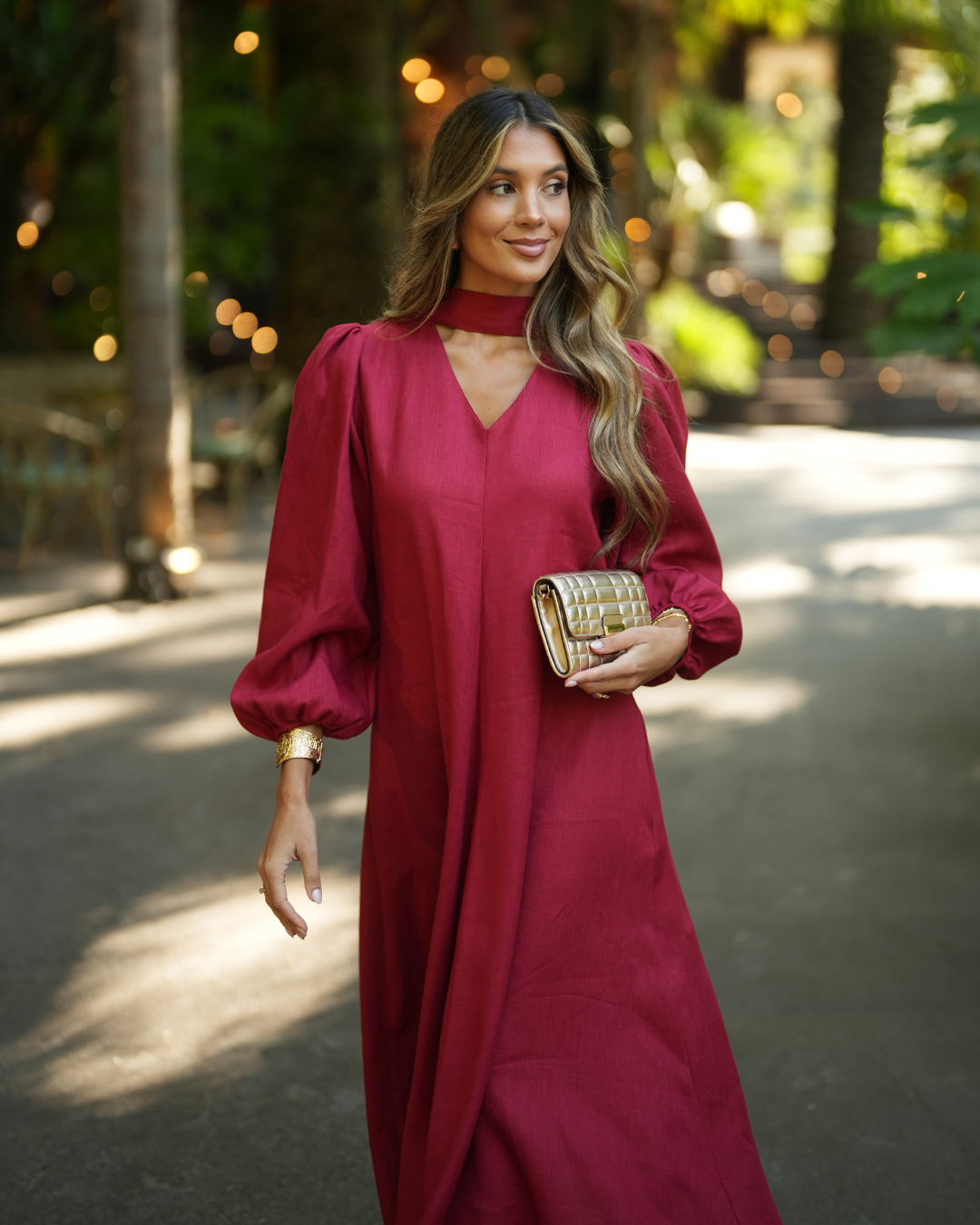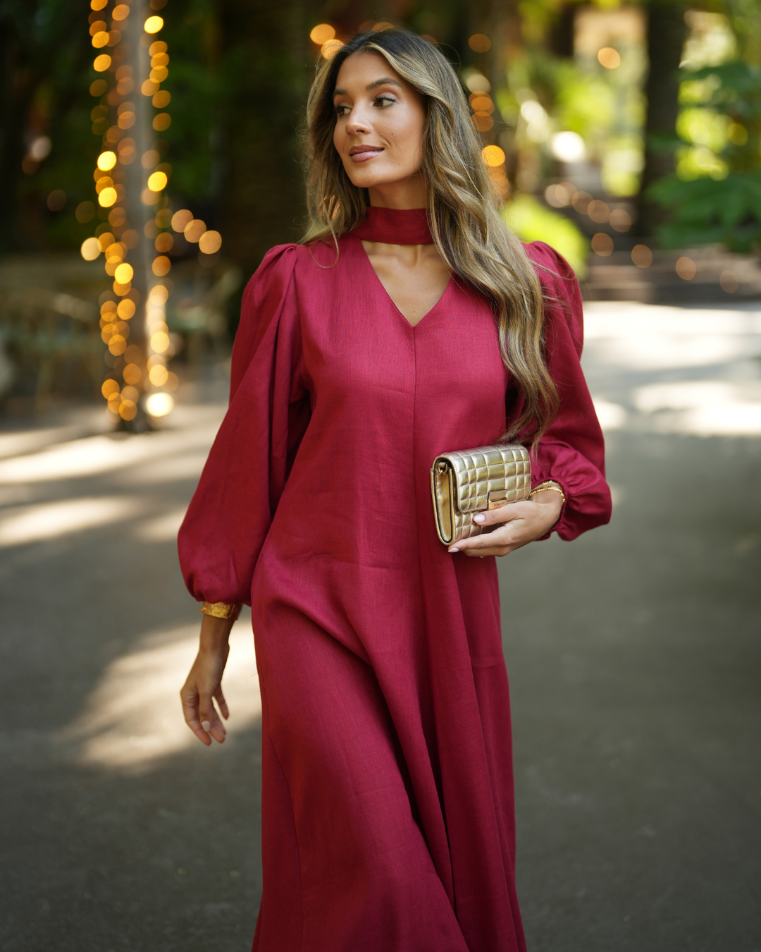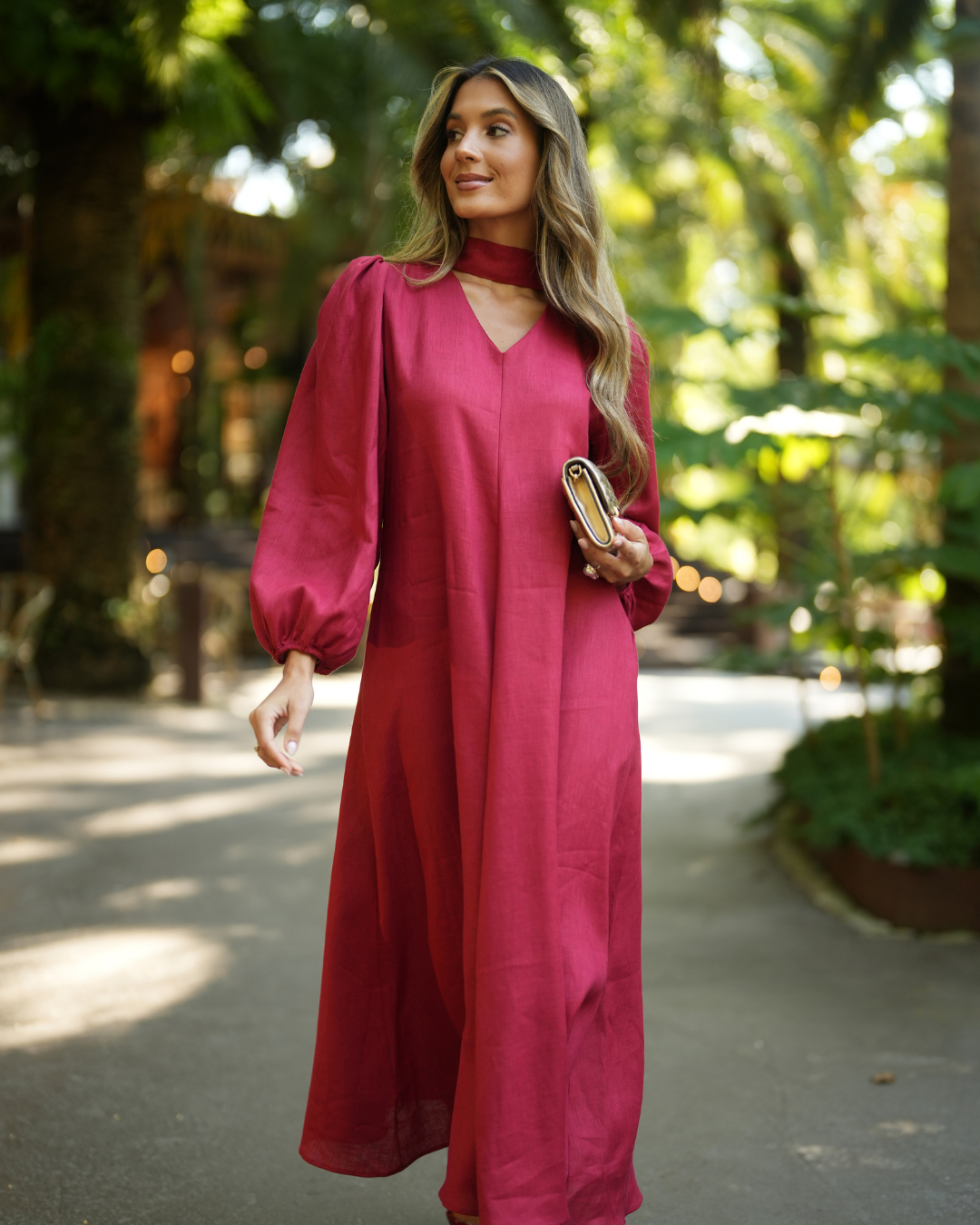 Vestido midi em tecido 100% linho, todo forrado em algodão. Com cinto incluído que pode ser usado na cintura ou no pescoço como lenço. Vai poder encontrar o nosso logótipo do trevo coração bordado em linha lurex dourada. Mangas curtas abalonadas. Desde um look casual a um look mais formal para cerimónia este nosso novo vestido é perfeito.