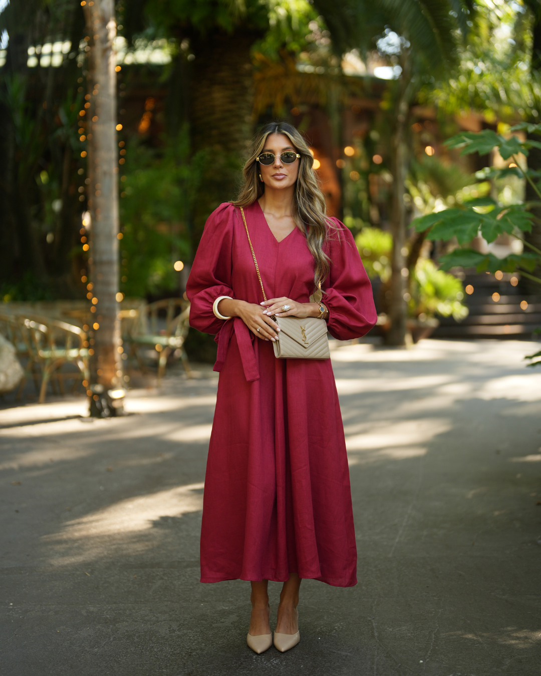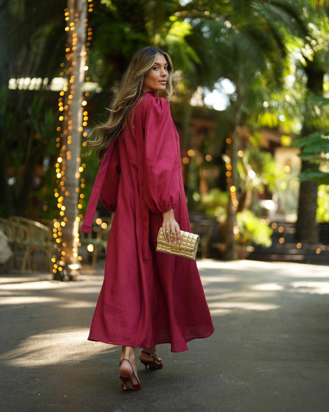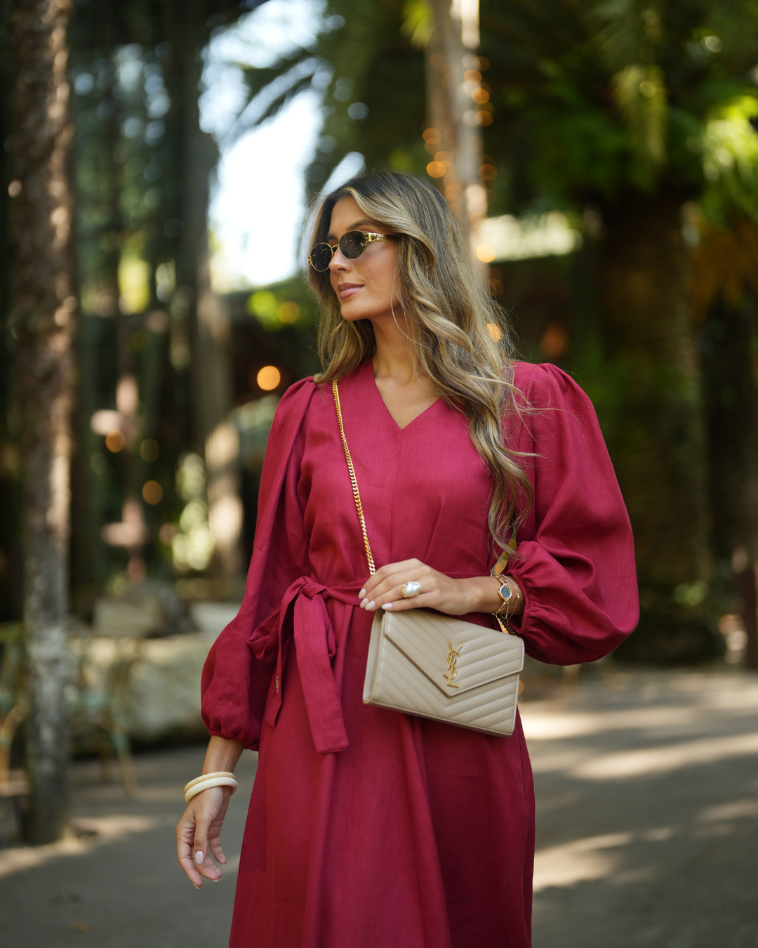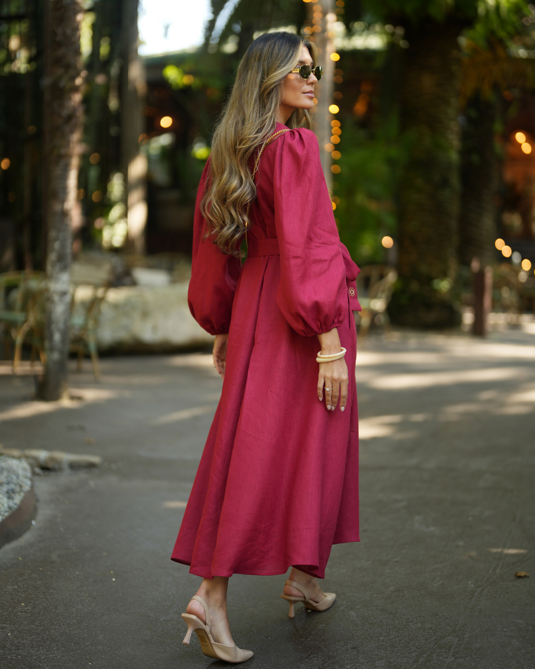 Vestido midi em tecido 100% linho, todo forrado em algodão. Com cinto incluído que pode ser usado na cintura ou no pescoço como lenço. Vai poder encontrar o nosso logótipo do trevo coração bordado em linha lurex dourada. Mangas curtas abalonadas. Desde um look casual a um look mais formal para cerimónia este nosso novo vestido é perfeito.