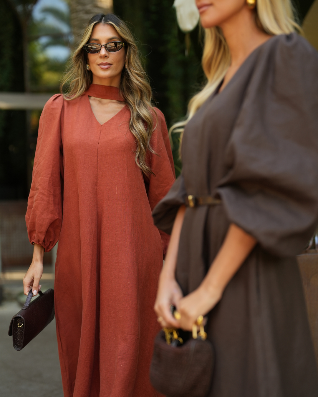 Vestido midi em tecido 100% linho, todo forrado em algodão. Com cinto incluído que pode ser usado na cintura ou no pescoço como lenço. Vai poder encontrar o nosso logótipo do trevo coração bordado em linha lurex dourada. Mangas compridas abalonadas que permitem ser usadas também em 3/4. Desde um look casual a um look mais formal para cerimónia este nosso novo vestido é perfeito.