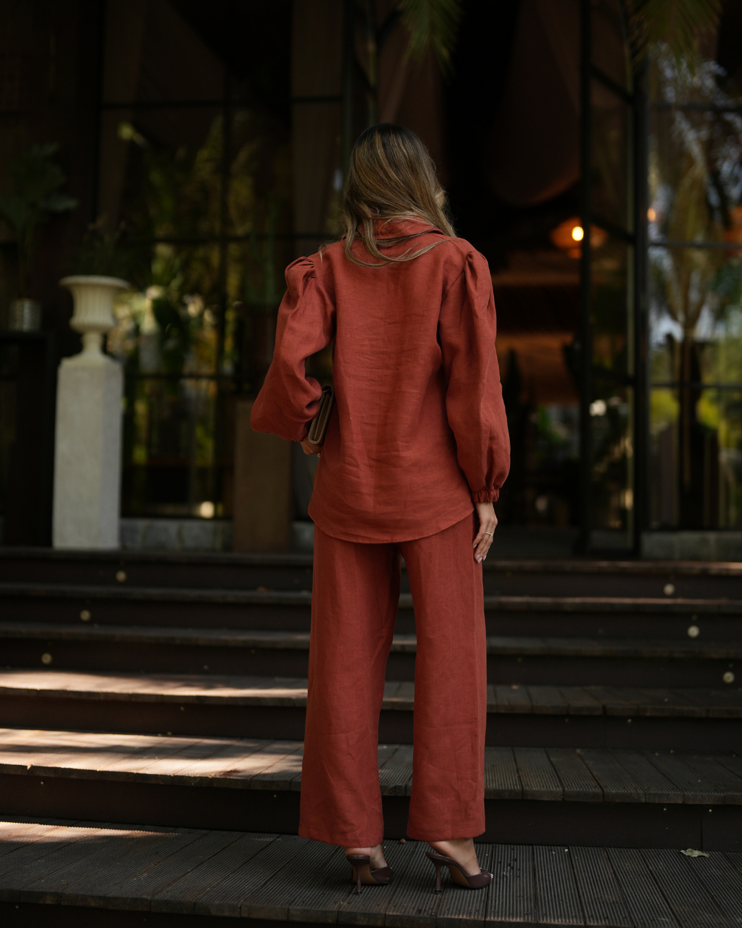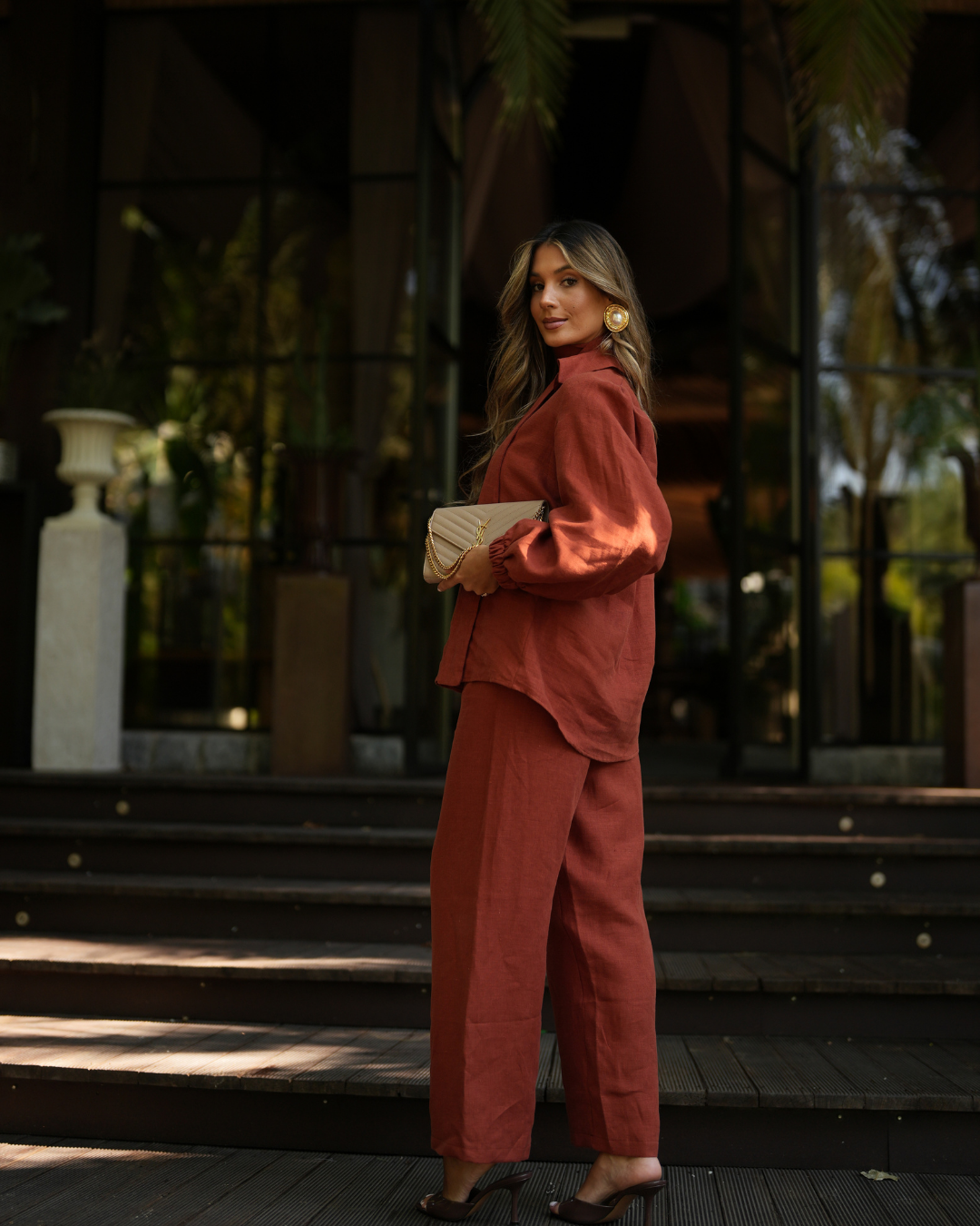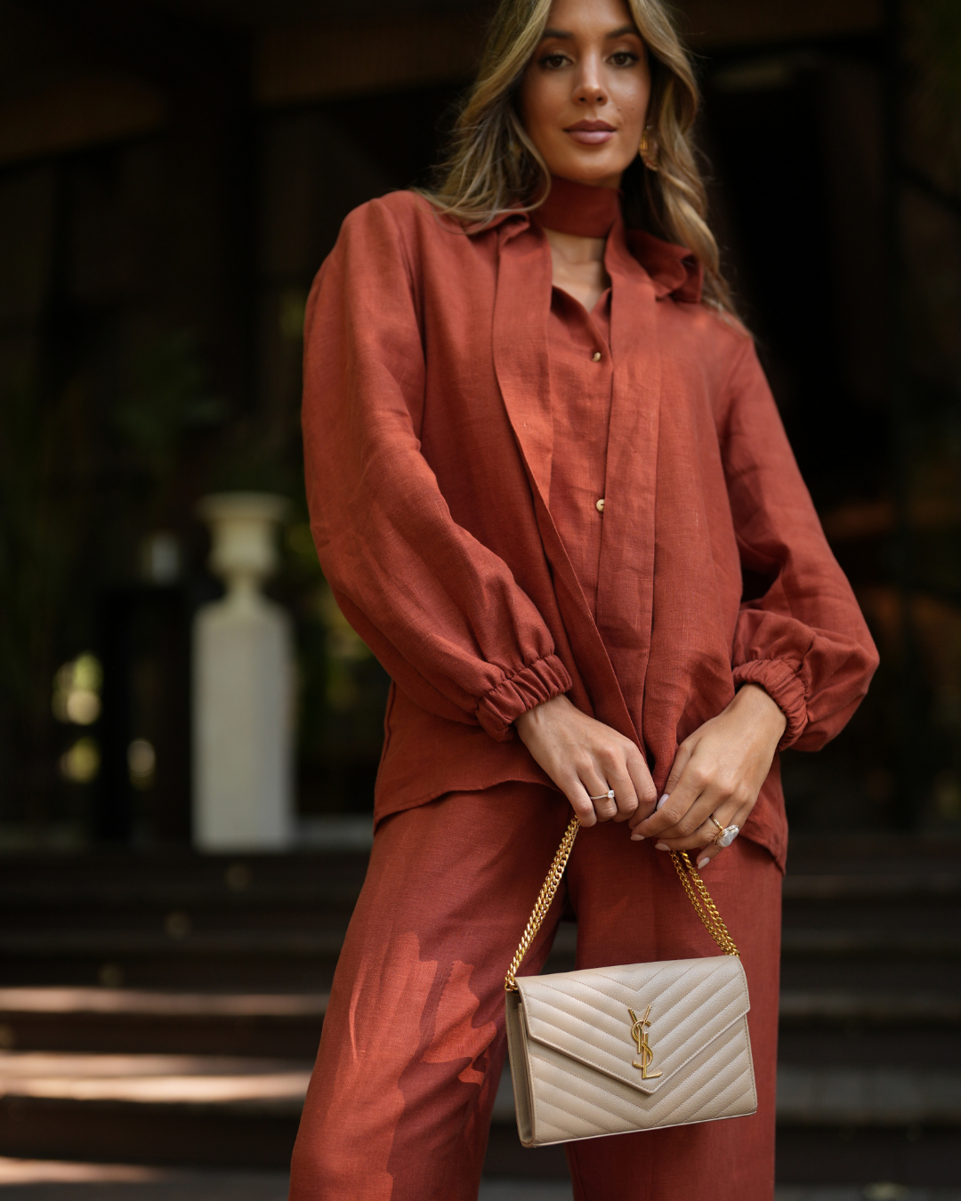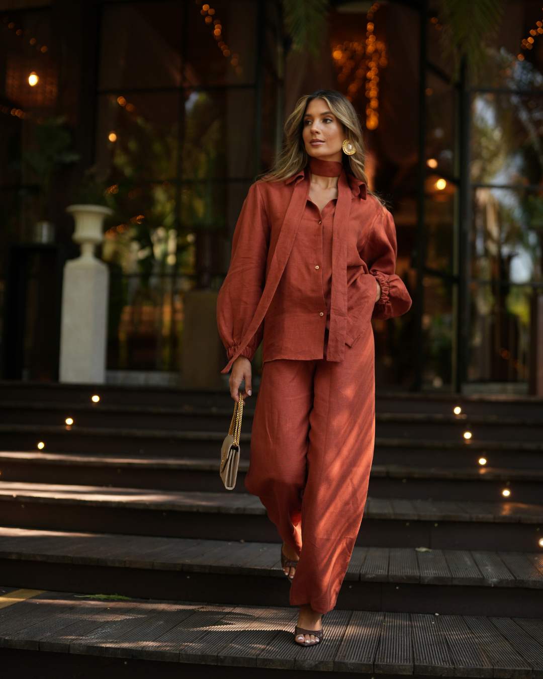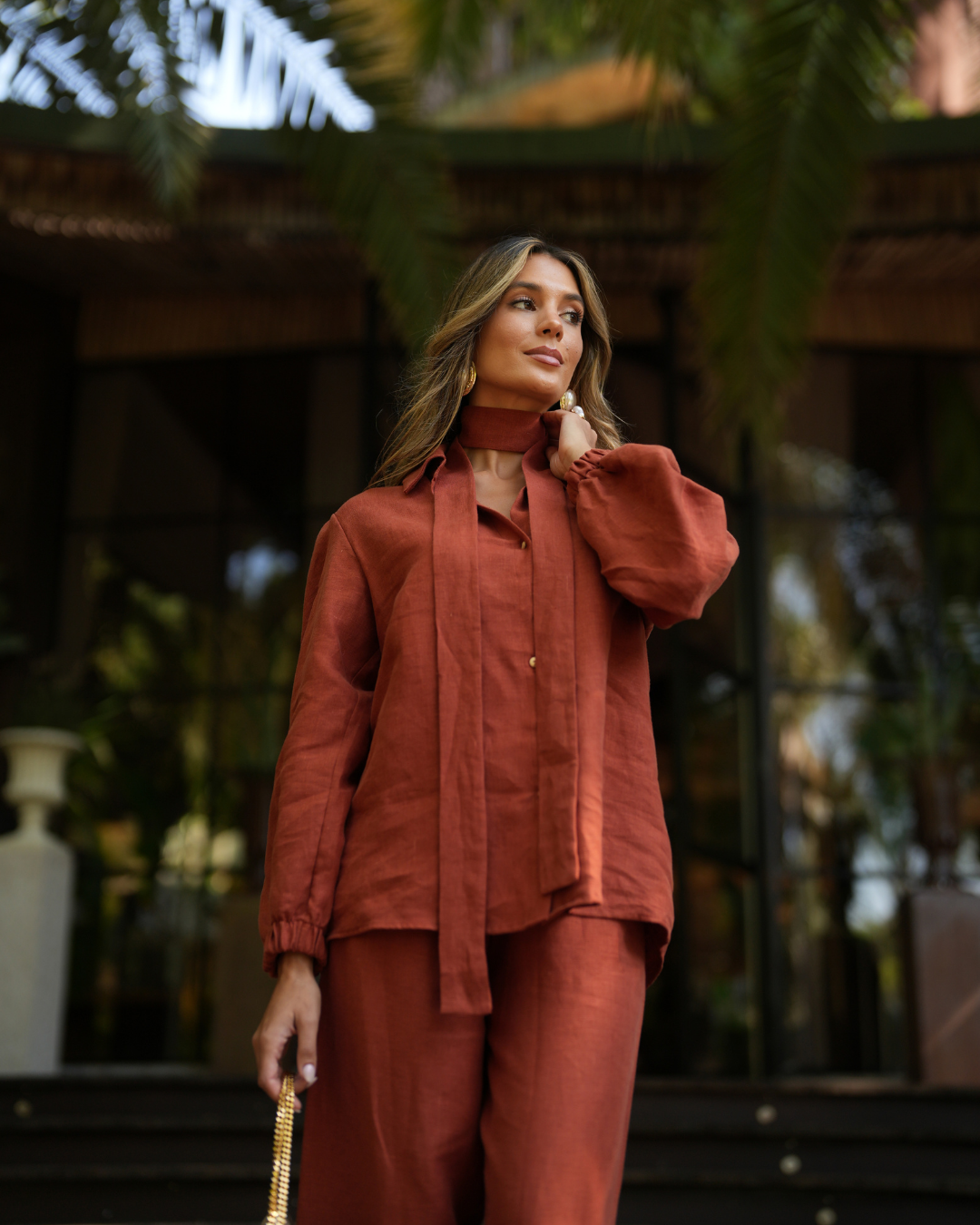 A camisa que respira moda em todos os seus detalhes e qualquer pessoa com gosto por moda vai querer ter. Feminina e fluída, em 100% linho. Com colarinho que lhe concede um toque clássico,. Mangas abalonadas e compridas. Conseguimos facilmente transformá-las em mangas 3/4. Inclui cinto que também pode ser usado como lenço/encharpe, em que contém o nosso logótipo do trevo bordado em dourado.