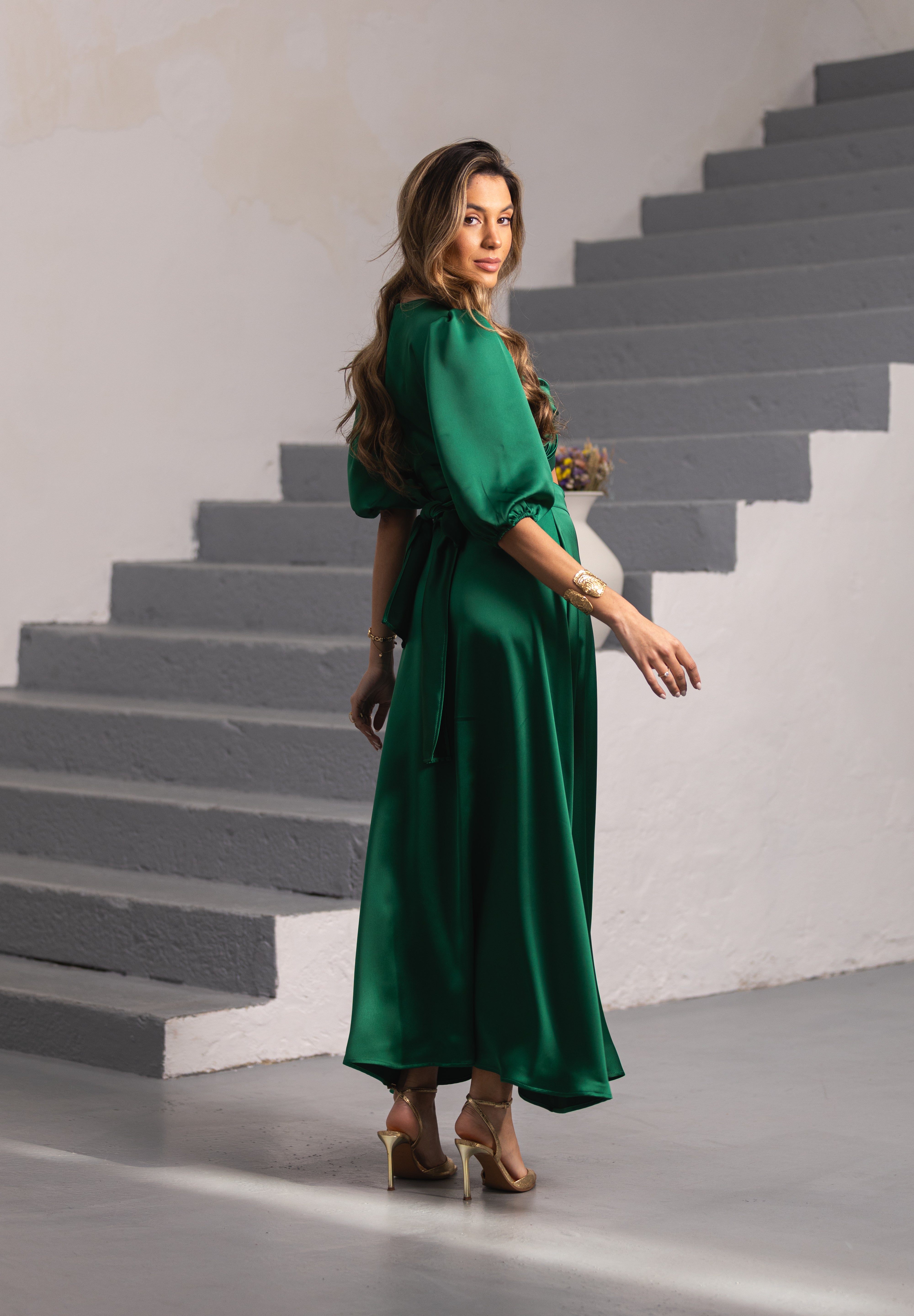 Apresenta um decote trespassado em V na parte da blusa, que aperta com fitas ajustáveis, permitindo diferentes formas de utilização. As mangas abalonadas podem ser usadas em versão 3/4 ou mais curtas, adaptando-se facilmente ao estilo pretendido. A saia possui fecho lateral invisível integrado na costura, garantindo um acabamento discreto e elegante.Nesta cor, o vestido encontra-se disponível em tecido acetinado.