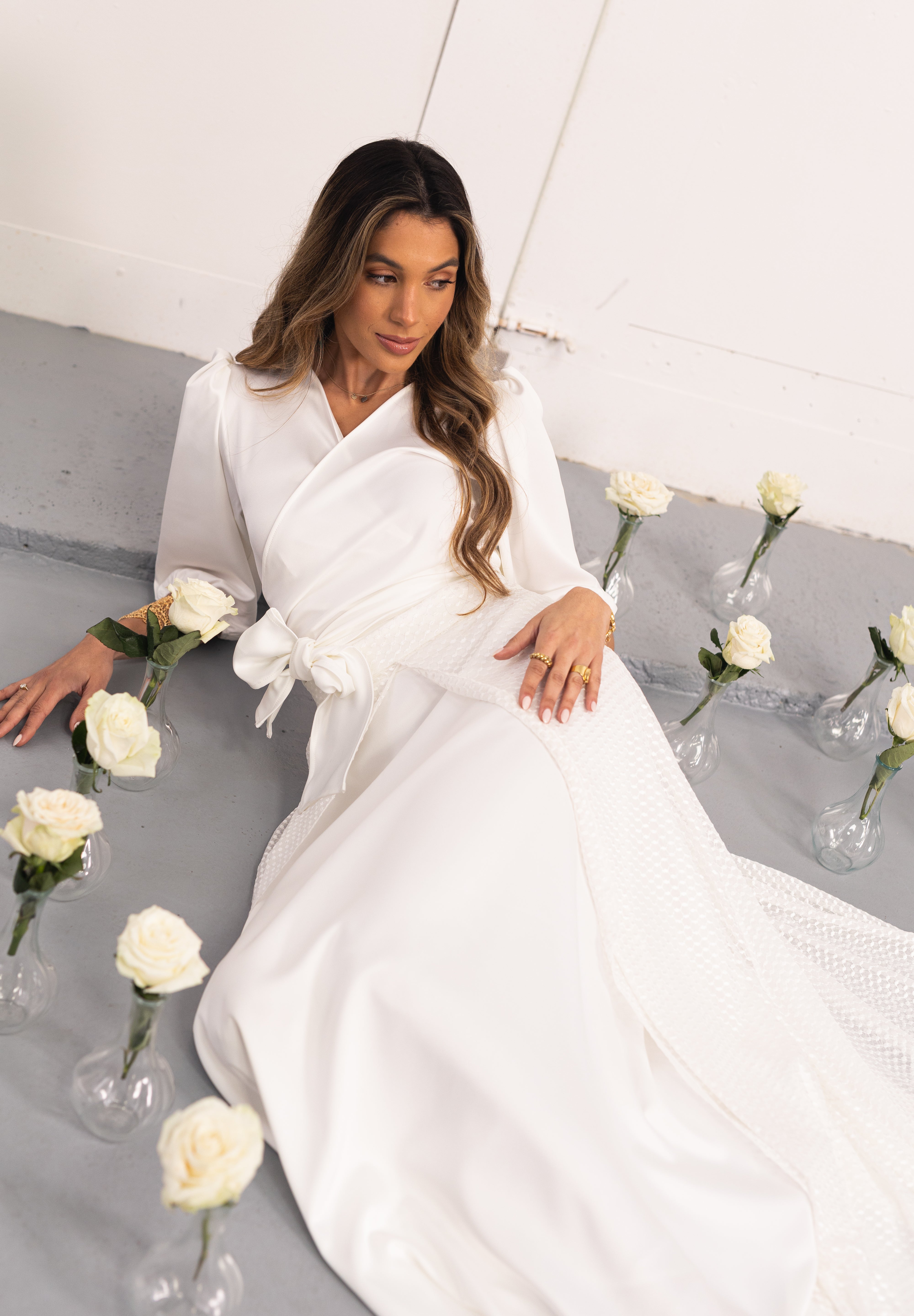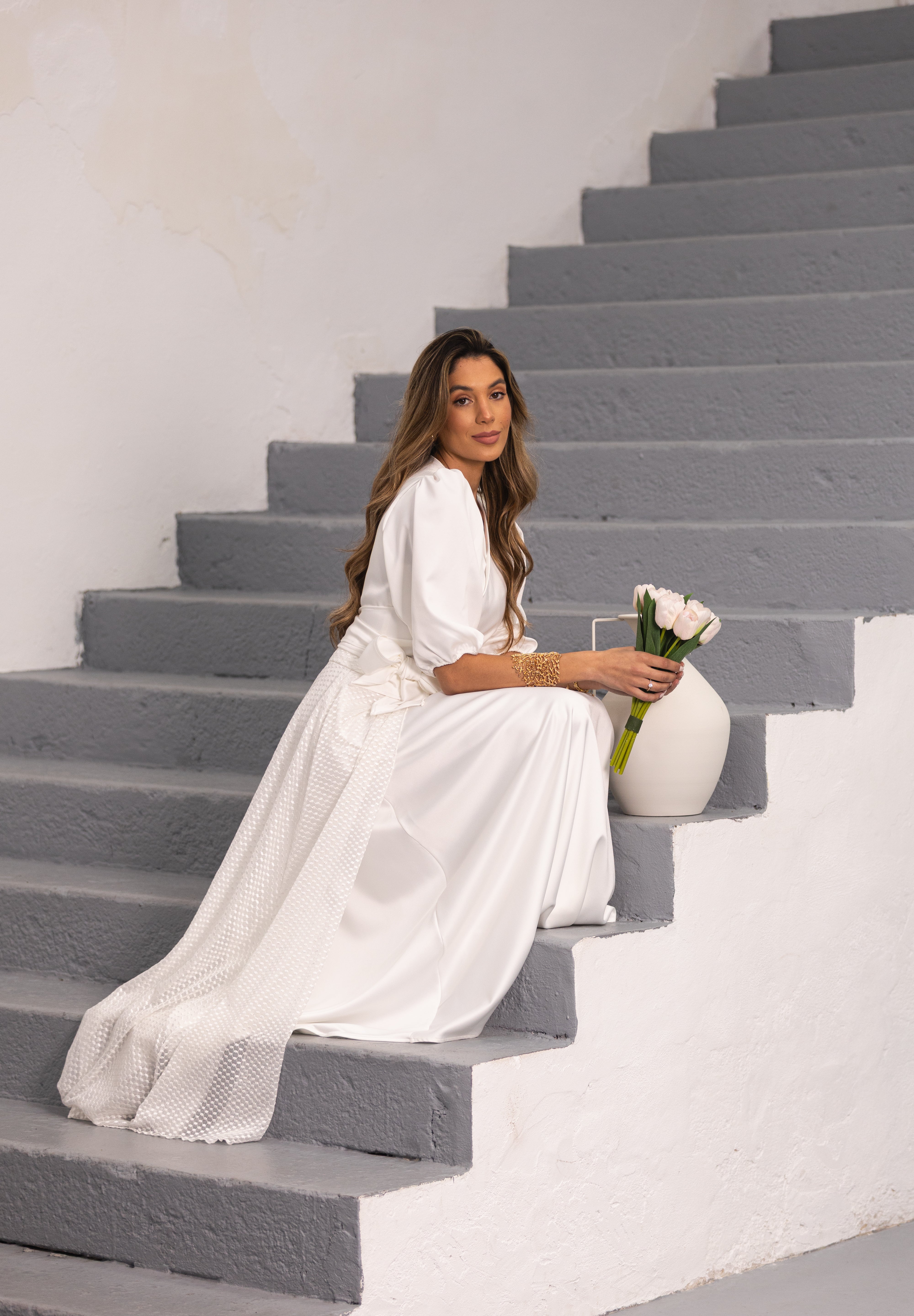 Confecionada em renda branca, destaca-se pelos 20 botões forrados nas costas, que ocultam delicadamente o fecho invisível, em tecido acetinado do nosso Fénix Satin Dress White, criando um acabamento sofisticado e harmonioso. O efeito de cauda nas costas acrescenta movimento e leveza à peça, tornando-a ainda mais especial. Na parte frontal, a saia apresenta uma abertura central que confere modernidade e liberdade de movimento.