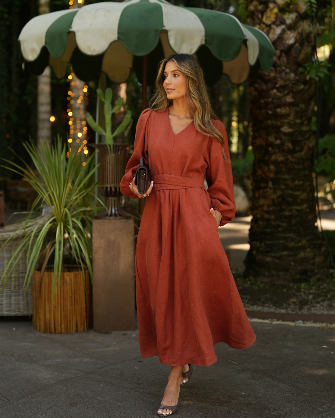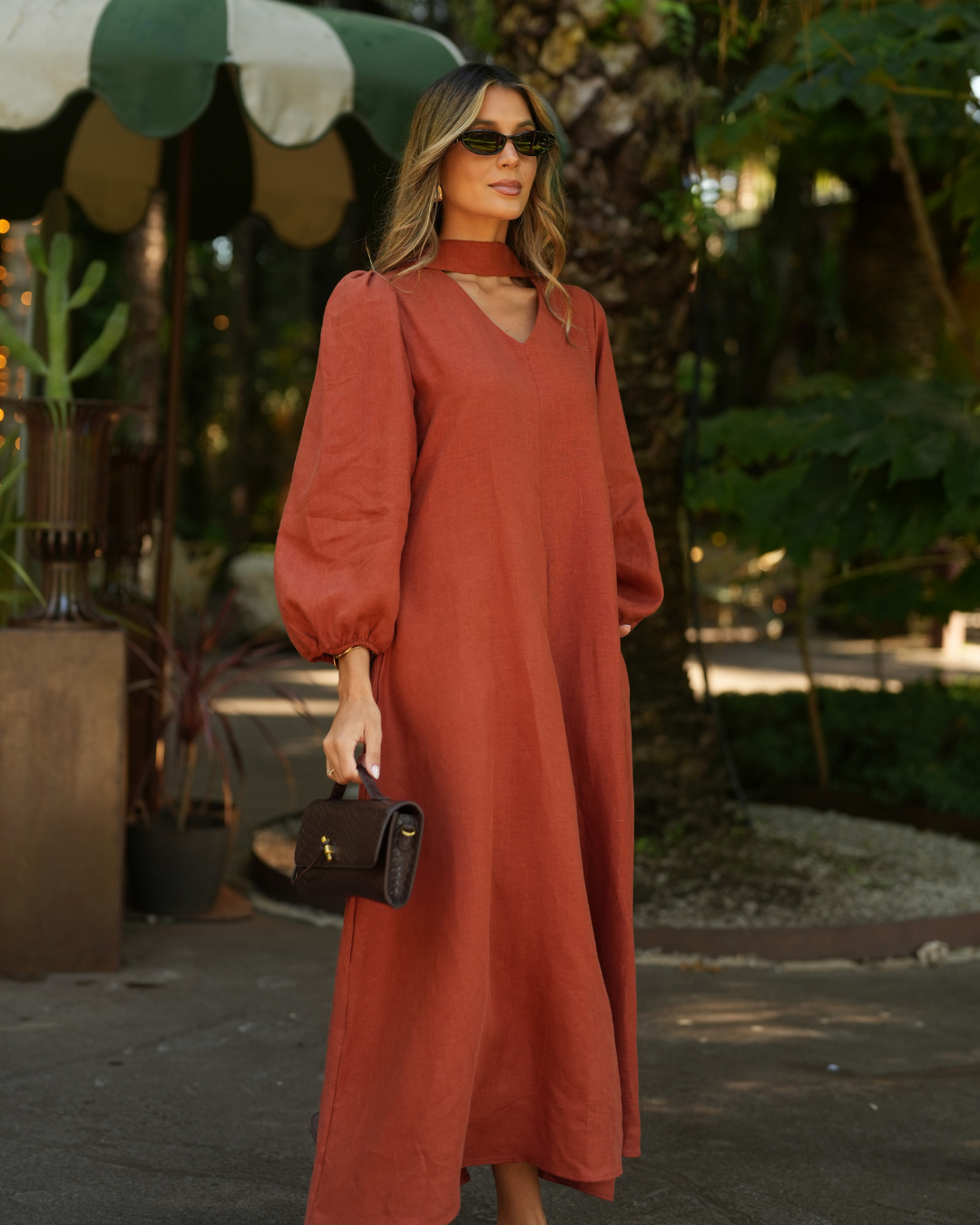 Vestido midi em tecido 100% linho, todo forrado em algodão. Com cinto incluído que pode ser usado na cintura ou no pescoço como lenço. Vai poder encontrar o nosso logótipo do trevo coração bordado em linha lurex dourada. Mangas compridas abalonadas que permitem ser usadas também em 3/4. Desde um look casual a um look mais formal para cerimónia este nosso novo vestido é perfeito.