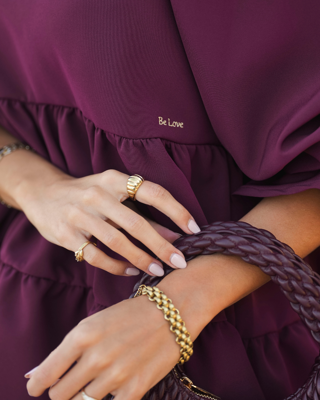 You will be able to be inspired by the statement Be Love embroidered in gold lurex thread.