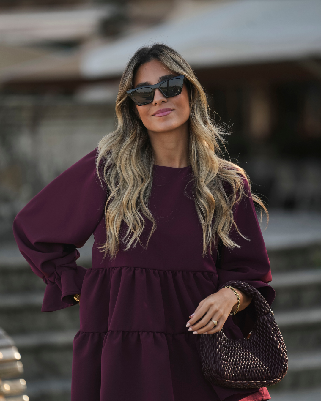 Round neckline that cinches at the teardrop waistband. Flared sleeves with elasticated cuffs ending in a ruffle, allowing you to wear 3/4 or long sleeves, giving it unique versatility and timelessness.