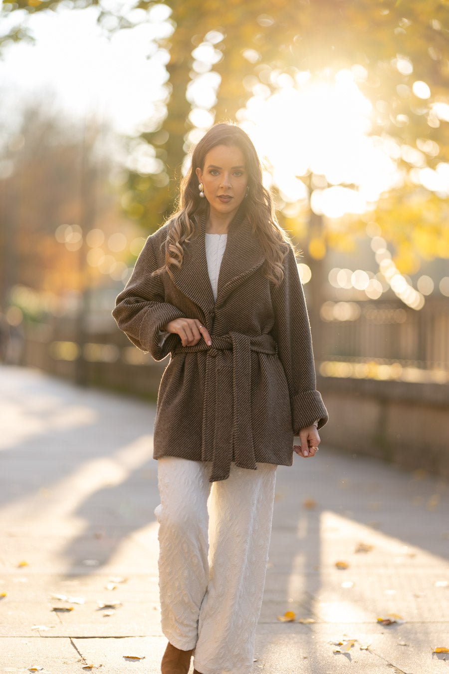 Fully lined in beige satin fabric sublimated with our logo. 3 jewel buttons, with puff sleeves that allow you to wear knitted garments, puff sleeves, and anything else you want without feeling uncomfortable. The sleeves end in pleated cuffs. With side pockets at the waist.