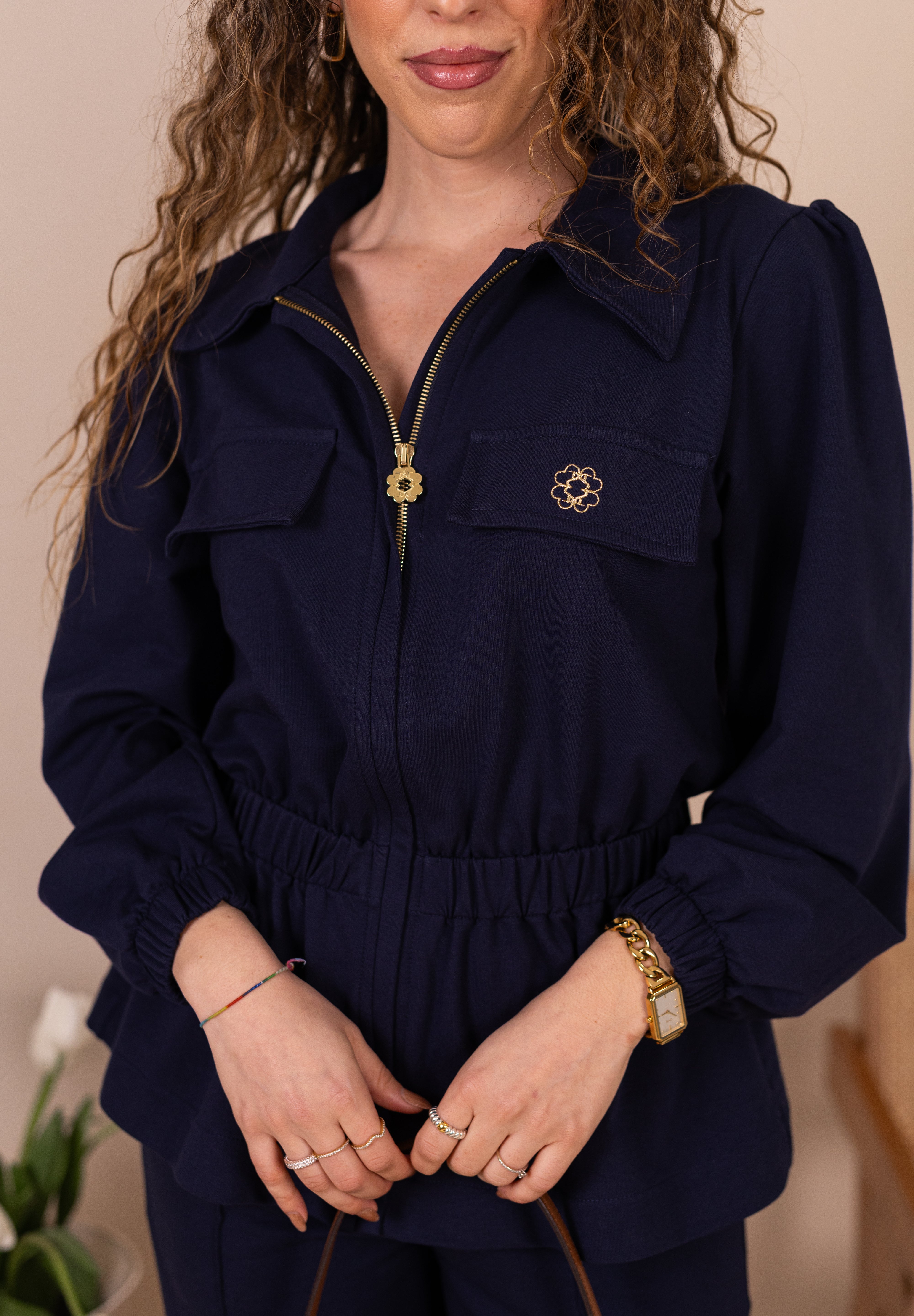 Casaco/Blusa em malha felpa italiana, com elástico na cintura que forma um delicado folho, criando um fitting elegante e cintado. Apresenta fecho dourado com patilha personalizada com o nosso monograma do trevo, e na lapela destaca-se o monograma bordado em linha dourada brilhante, detalhes que elevam a sofisticação da peça.