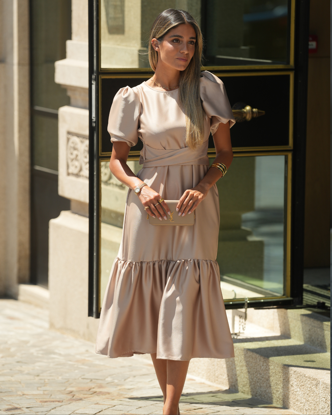 Vestido midi com folho, com decote redondo na frente e nas costas contém decote ligeiro em V. Fecho invisível pelo cós, que permite usarmos na frente ou nas costas, permitindo assim abertura fácil do decote. Com mangas 3/4 que terminam em elástico franzido que permite usarmos a manga mais comprida ou versão curta. Podemos usar, no mínimo 8 formas diferentes, através dos decotes, das diferentes formas de usarmos o cinto/laço e das mangas. Encontra no cinto a afirmação Rise Like The Stars bordada em linha lurex.