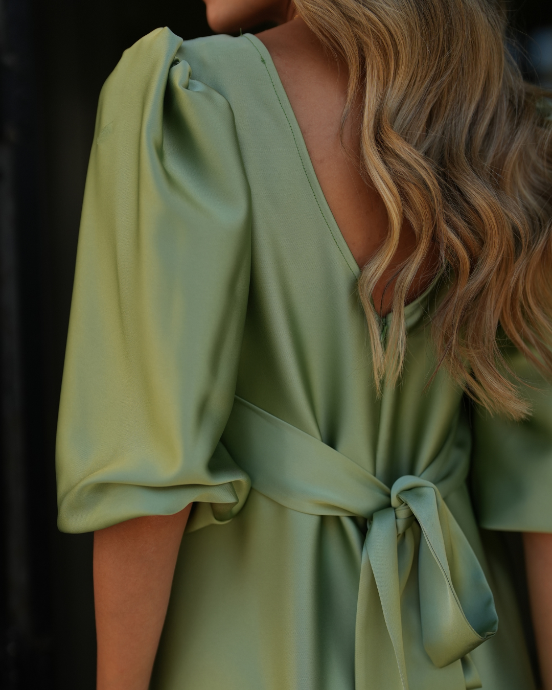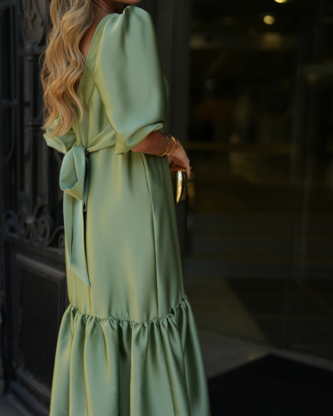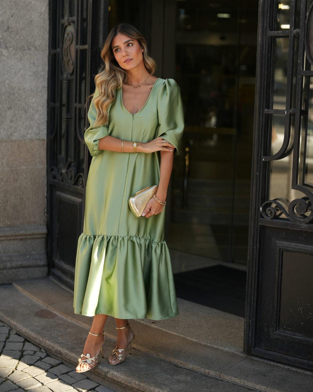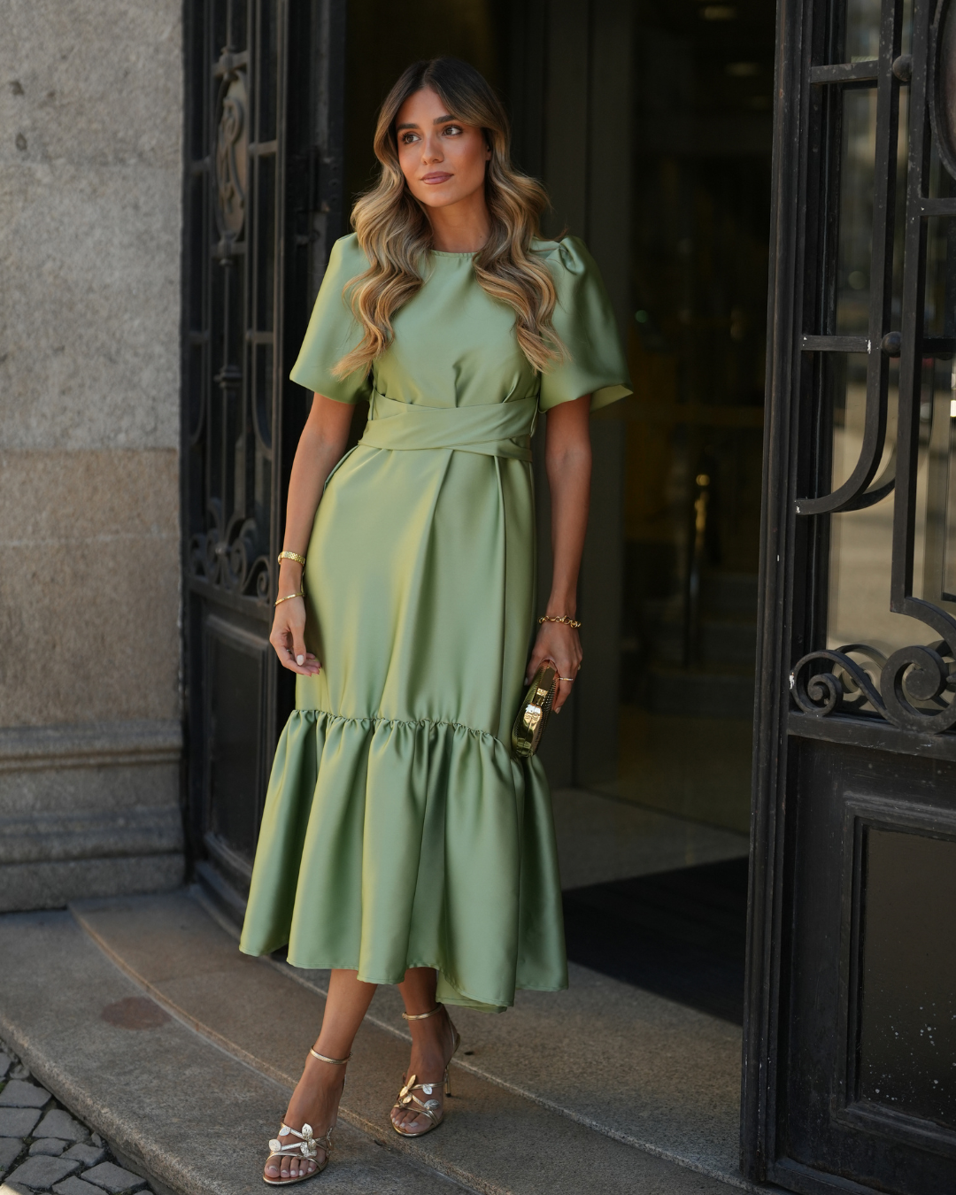 Vestido midi con volantes, escote redondo delante y detrás con ligero escote en pico. Cierre invisible en la cintura, que permite llevarlo por delante (favorable para la lactancia) o por detrás. Con mangas 3/4 que terminan en elástico que nos permite llevar la manga más larga o más corta. Podemos utilizar al menos 8 formas diferentes, a través de los escotes, las diferentes formas de utilizar el cinturón/lazo y las mangas. Incluye cinturón con la declaración Rise Like The Stars bordada en hilo de lurex.