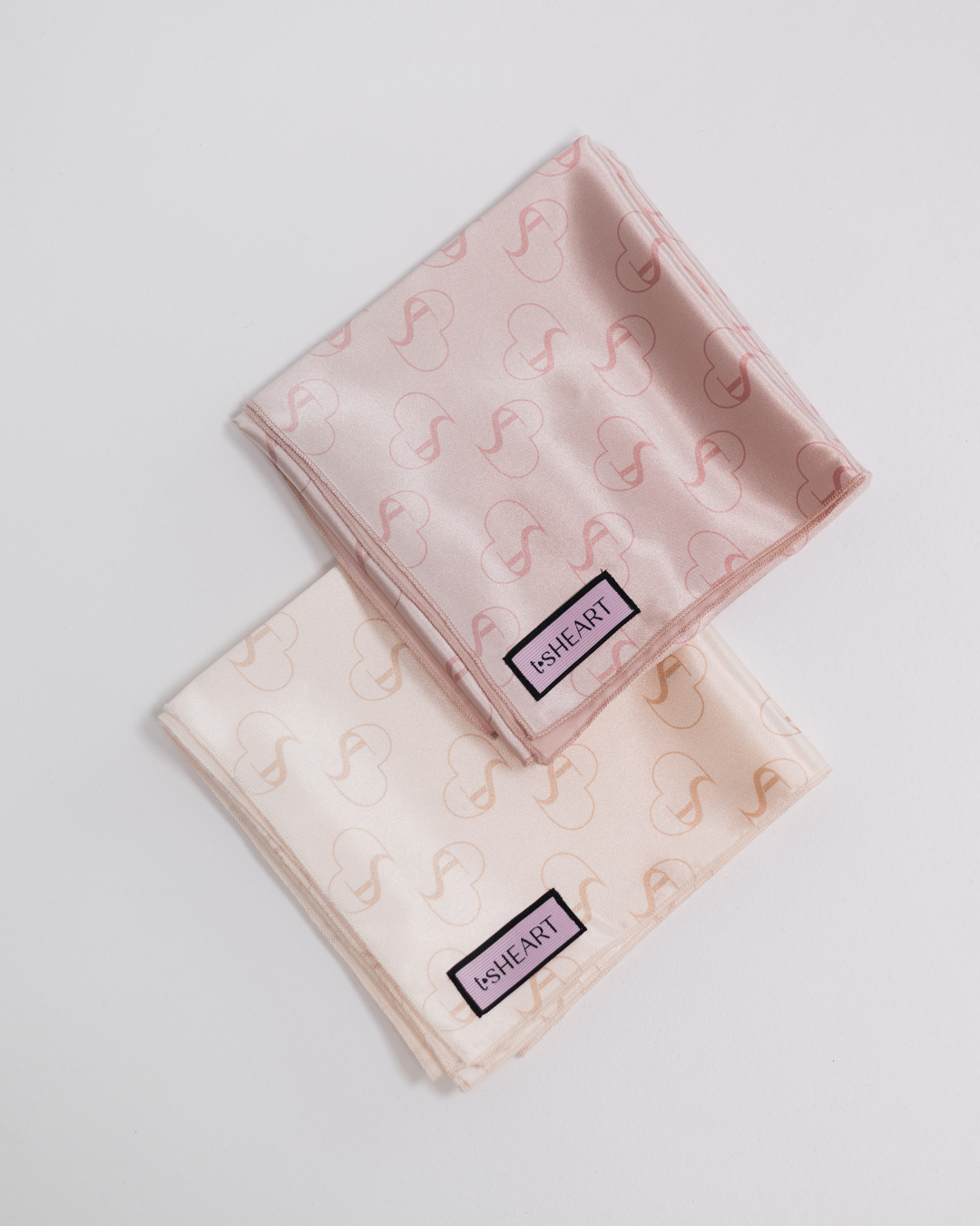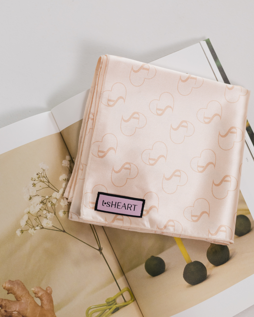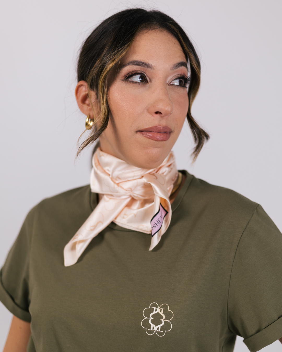 Bufanda t-sHEART 70 x 70 cm, en tejido satinado sublimado con nuestro logo all over al tono de arriba de fondo.