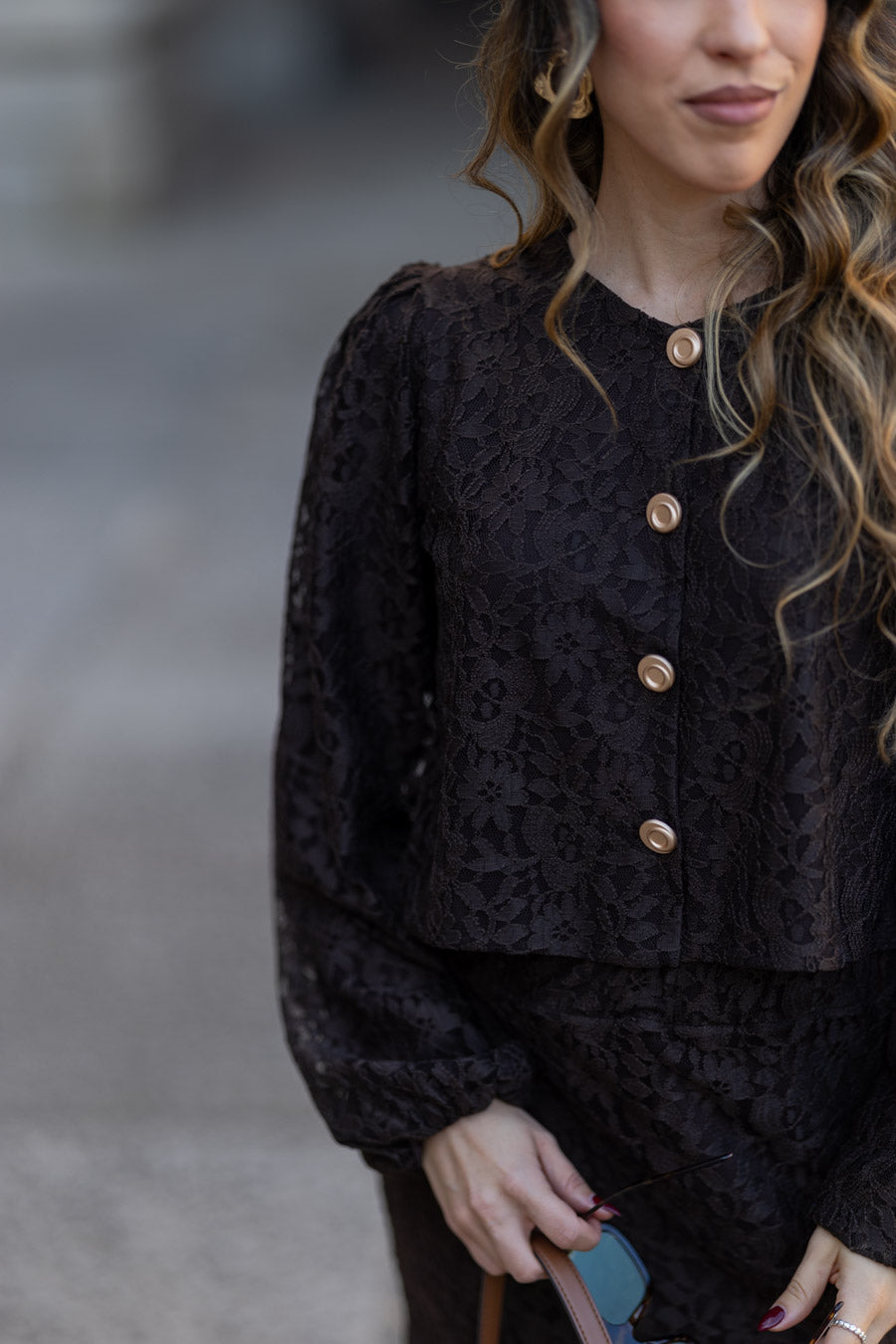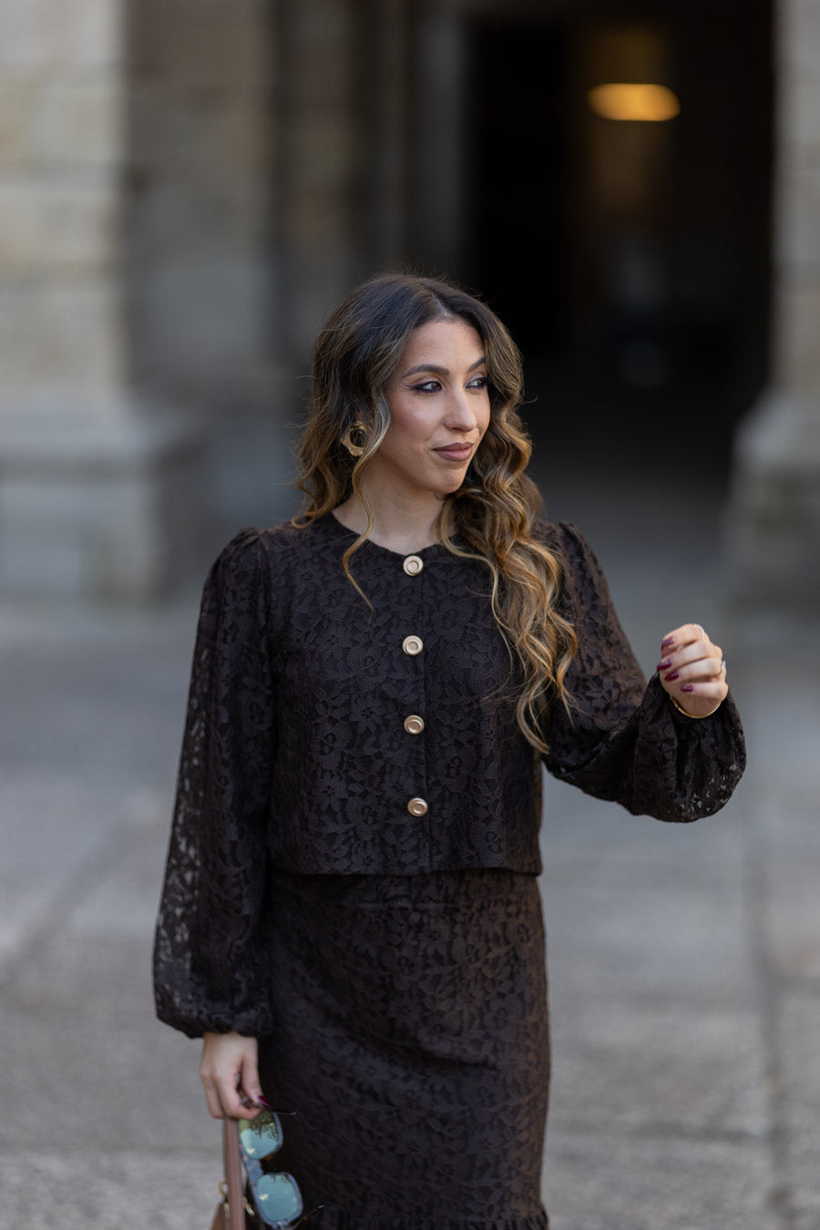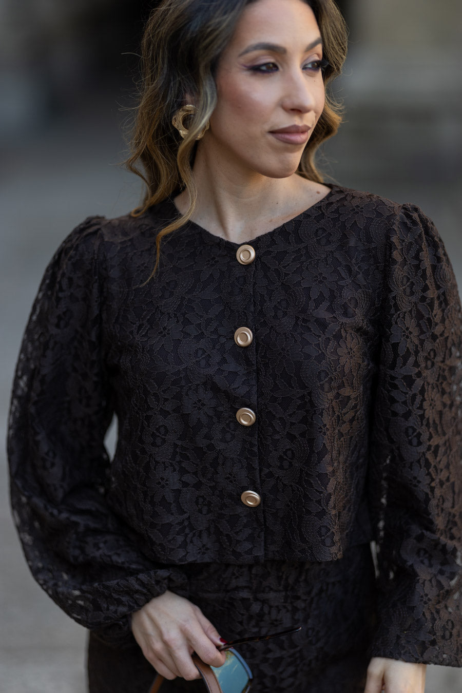 Blusa com fitting curto em estilo casaco, em tecido de renda, toda forrada em malha crepada à cor, abotoa com botões dourados que lhe concede um toque elegante. Perfeita para combinar com a nossa DANZA SKIRT, ou até mesmo com jeans e calções. Mangas compridas abalonadas mas que podem ser usadas em 3/4.