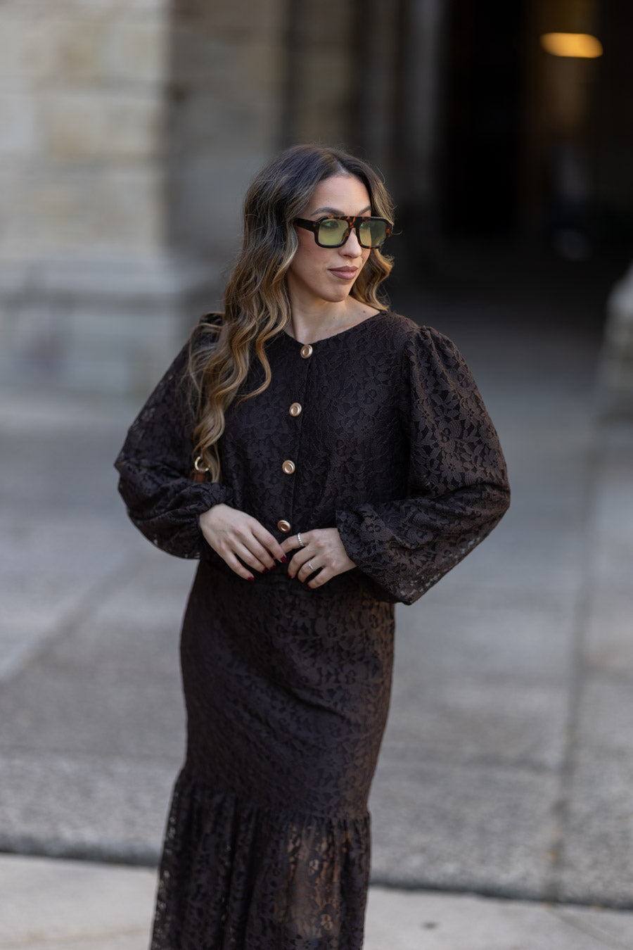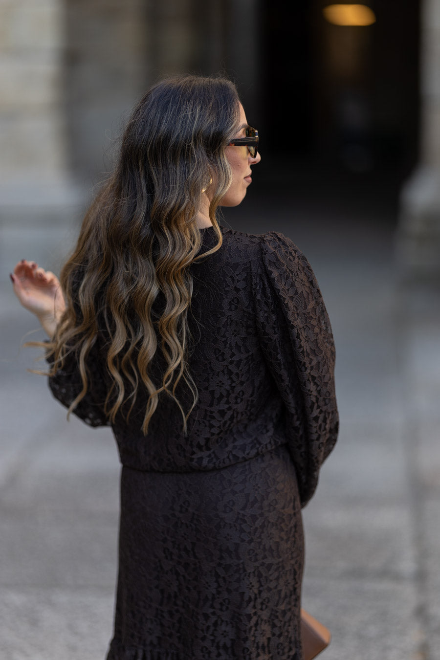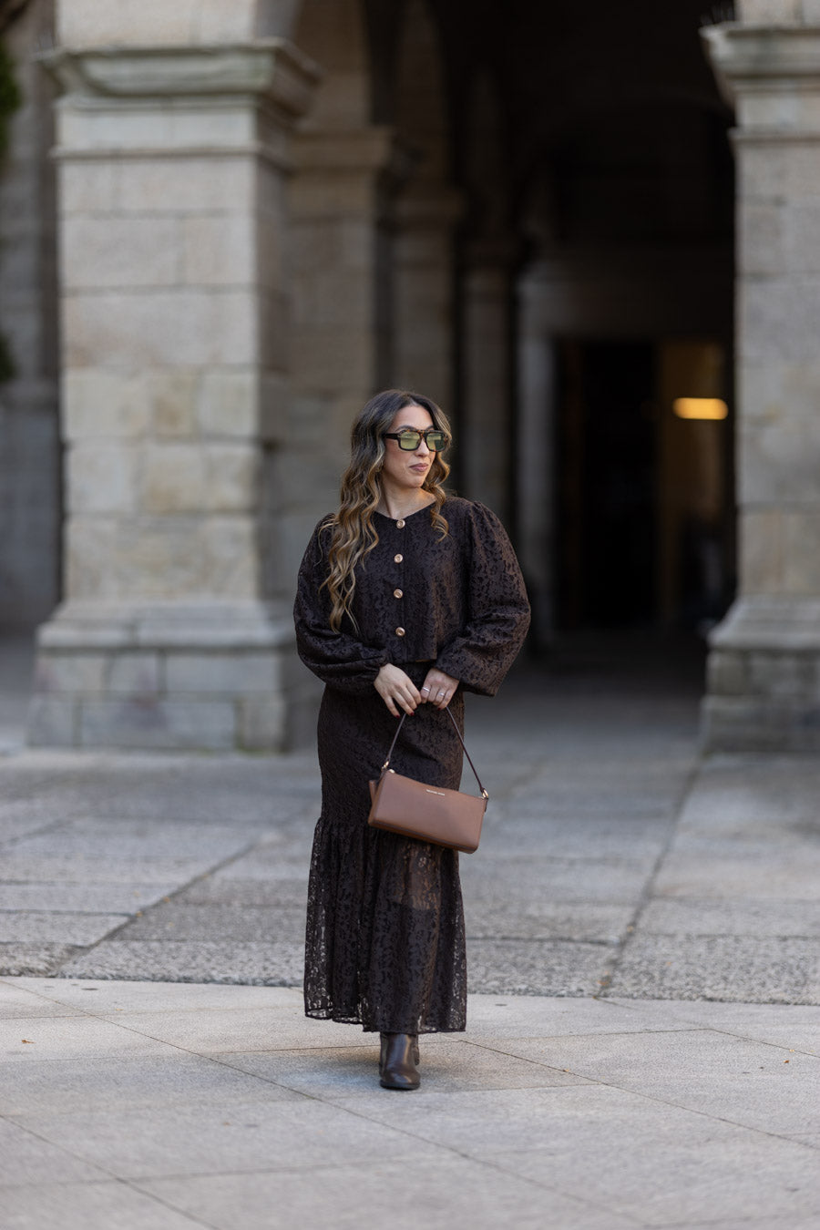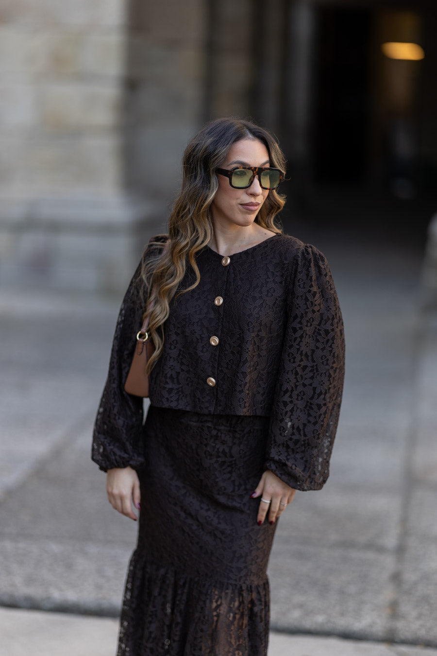 Blusa com fitting curto em estilo casaco, em tecido de renda, toda forrada em malha crepada à cor, abotoa com botões dourados que lhe concede um toque elegante. Perfeita para combinar com a nossa DANZA SKIRT, ou até mesmo com jeans e calções. Mangas compridas abalonadas mas que podem ser usadas em 3/4.