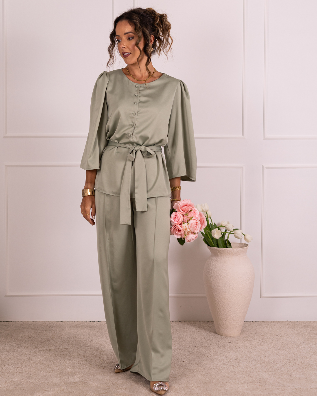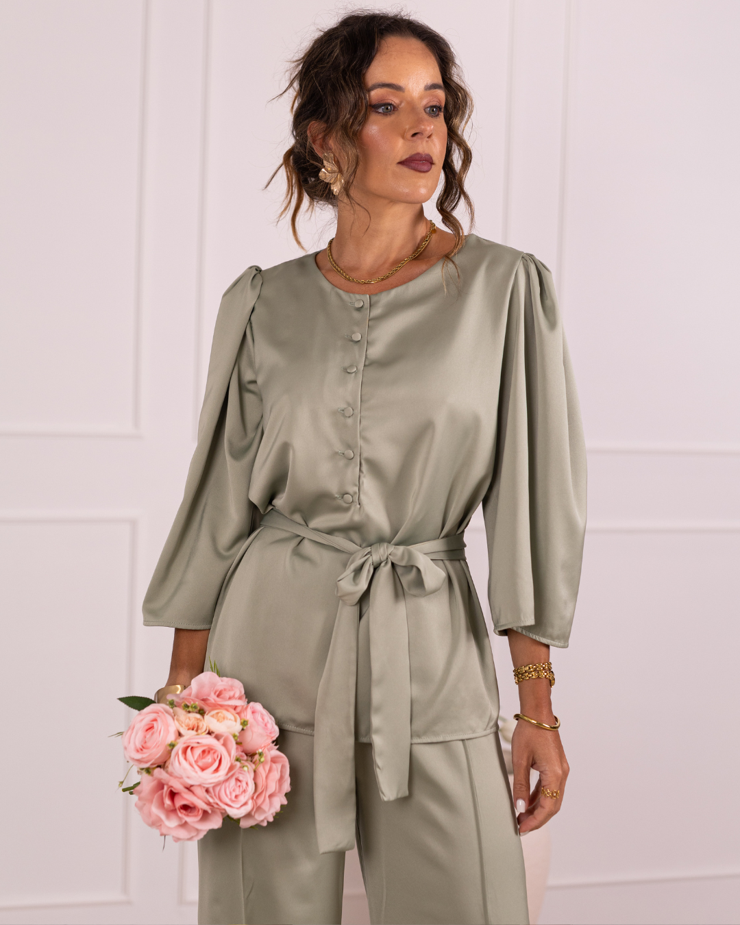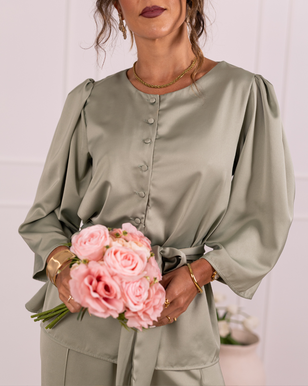 Blusa em tecido acetinado, elegante e fluído, com fita versátil que pode ser usada como cinto para definir a silhueta ou como encharpe, conferindo um toque mais sofisticado ao look.