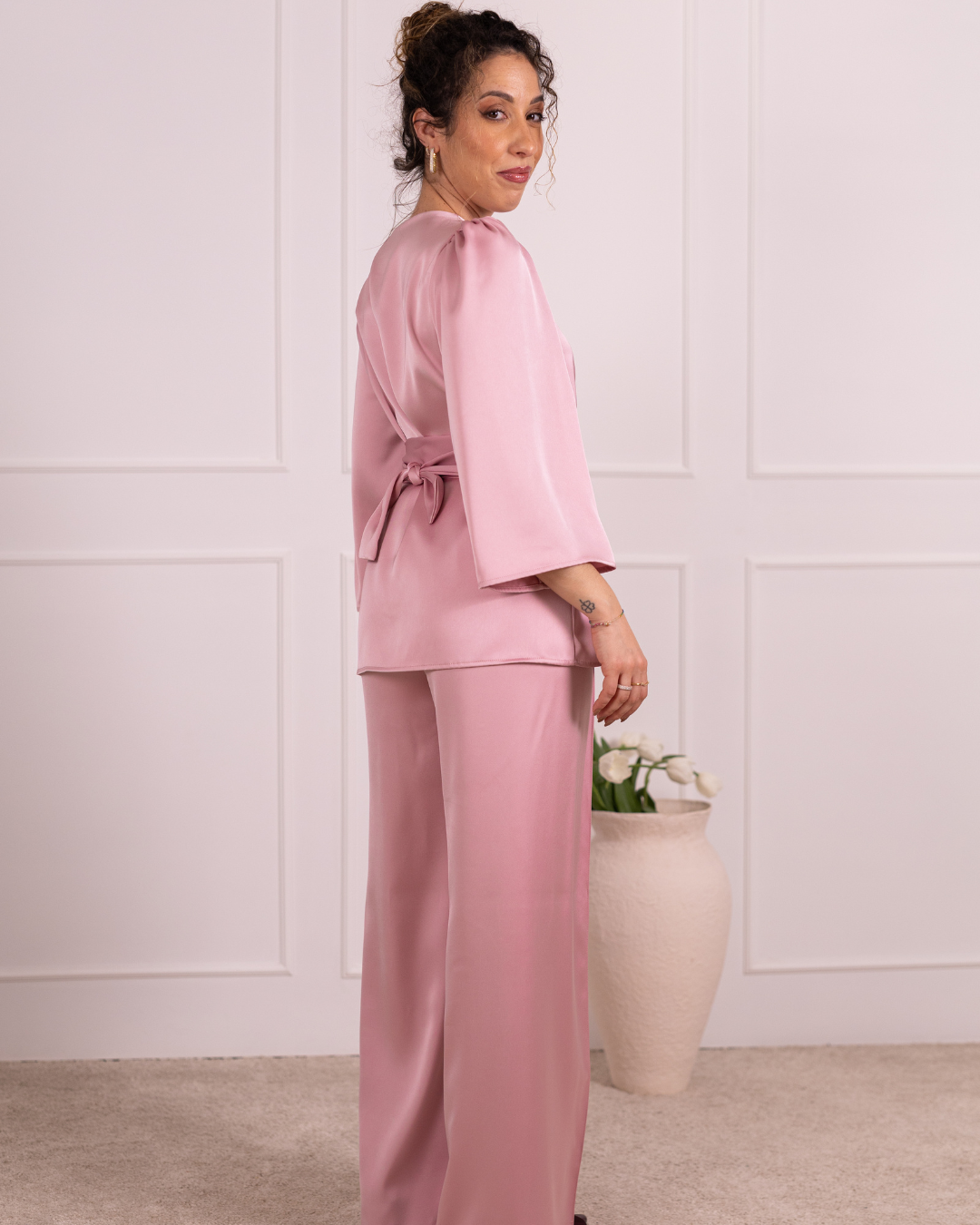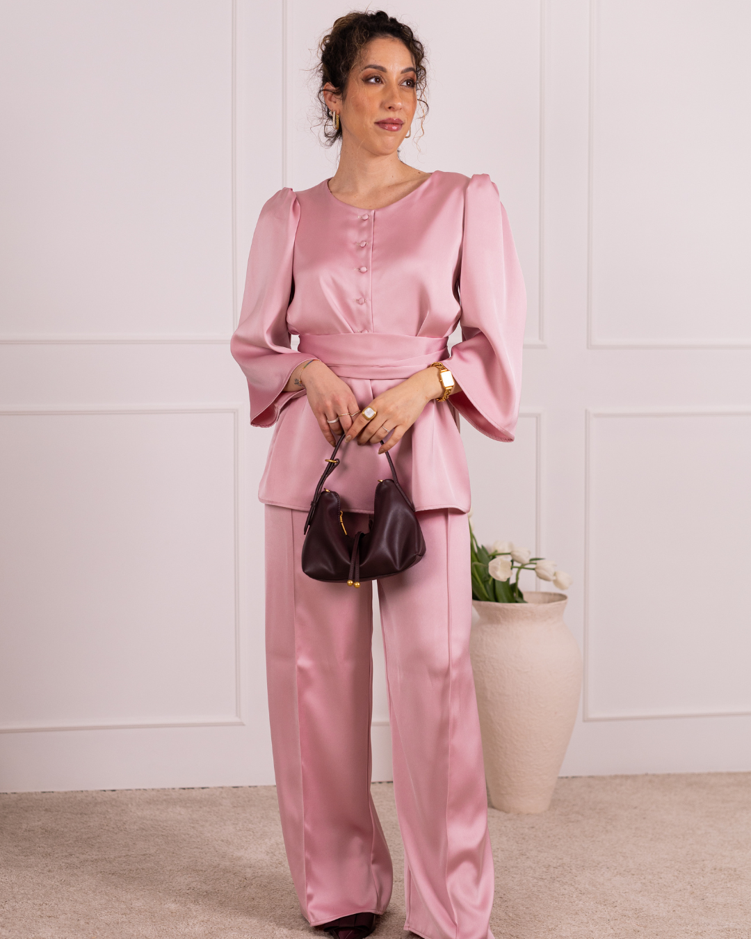 As nossas novas calças são confeccionadas em tecido acetinado, com um subtil brilho, que lhes confere sofisticação e leveza. De cintura subida, com elástico interior, adaptam-se confortavelmente a diferentes silhuetas, valorizando vários tipos de corpo. Contém o efeito de nervura que lhe atribui maior diferenciação.