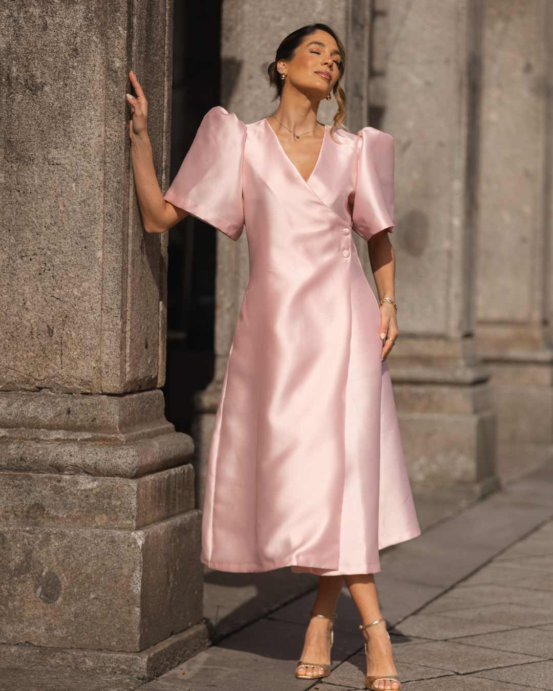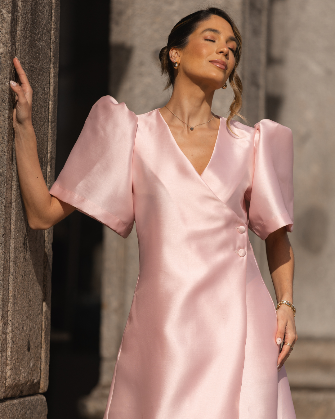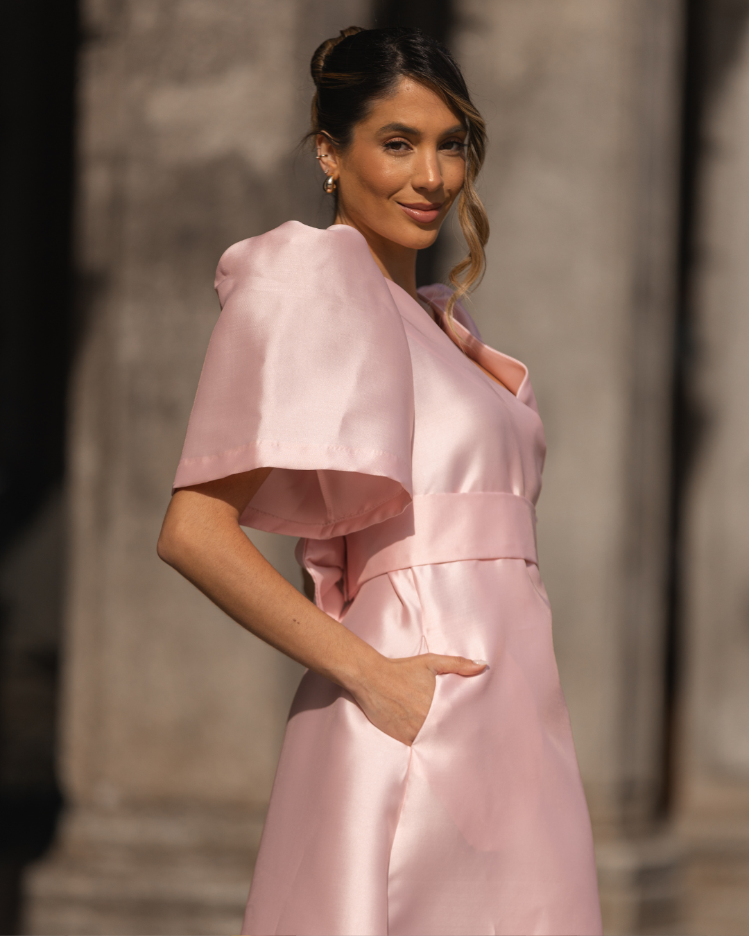 O vestido Bridgerton promete ser o verdadeiro diamante desta temporada. Confecionado em tecido mikado, conhecido pela sua estrutura e elegância, ideal para cerimónias, este vestido combina sofisticação e feminilidade em cada detalhe. As mangas bufantes incluem, no seu interior, um pequeno folho que acrescenta ainda mais estrutura e presença. O decote em bico em trespasse destaca-se pela sua elegância intemporal.