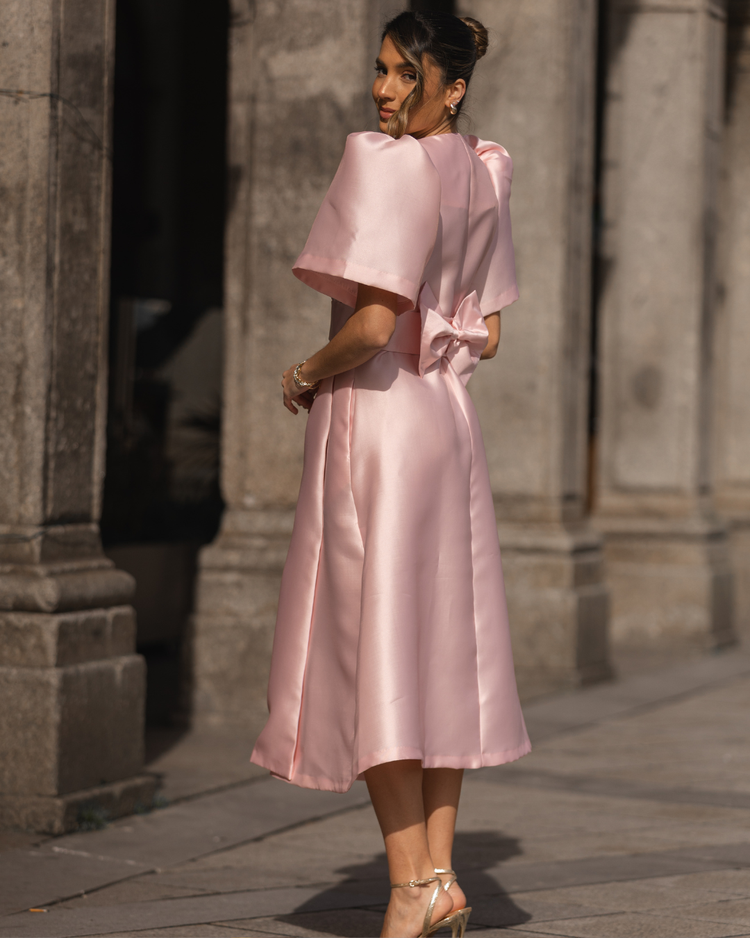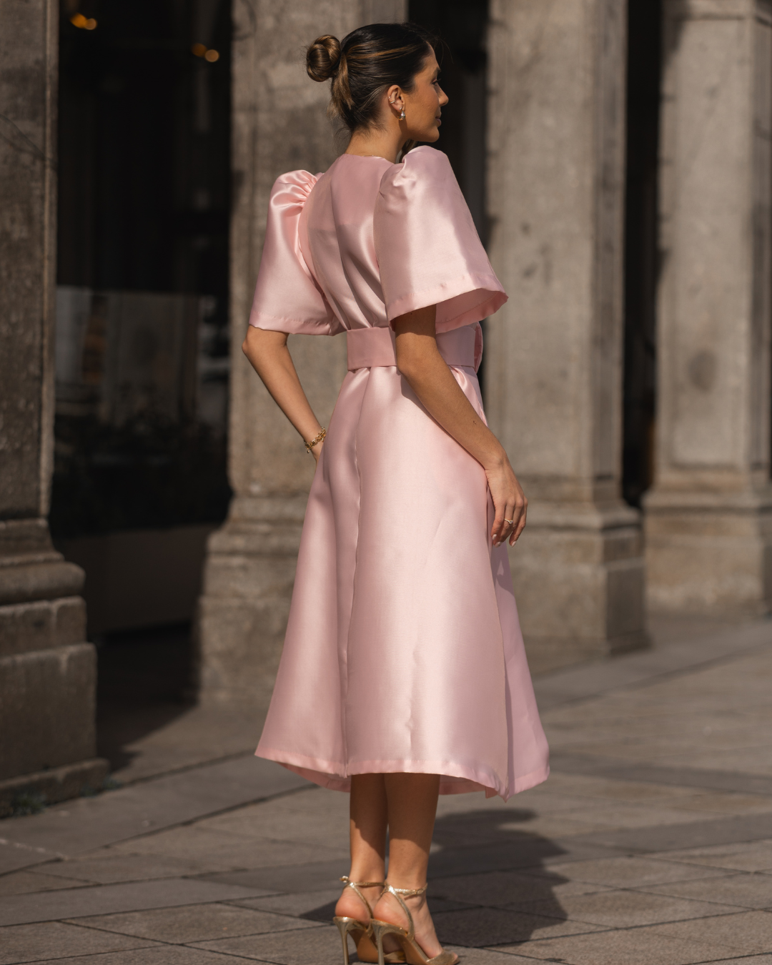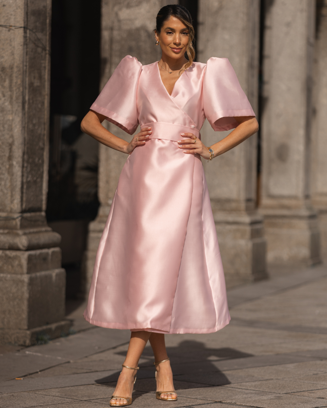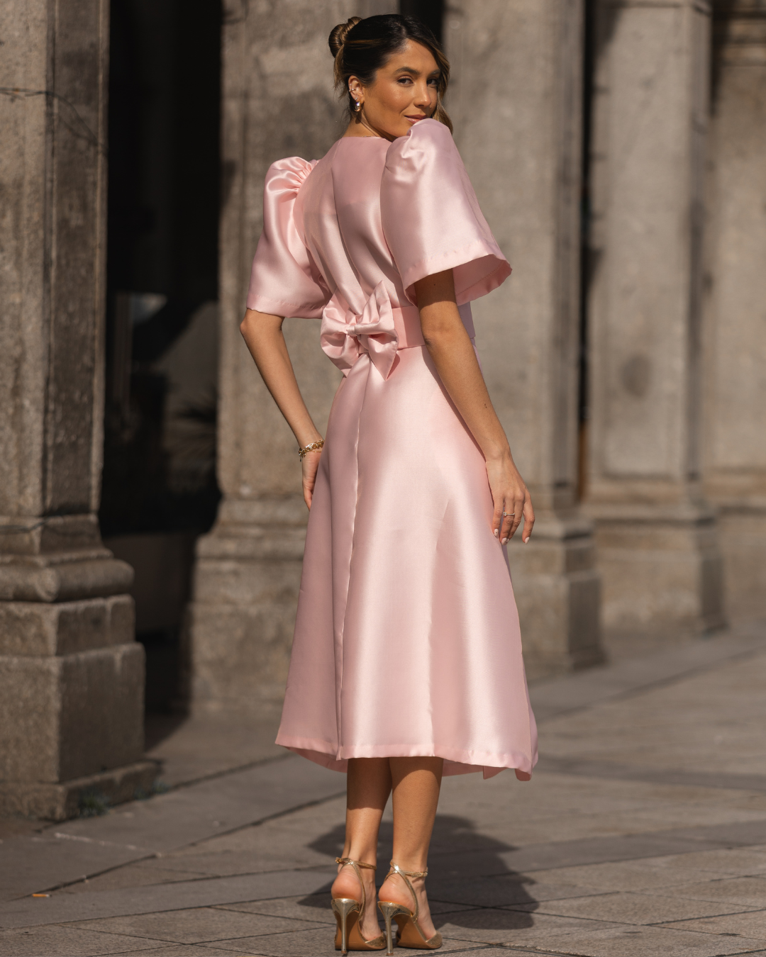 O vestido Bridgerton promete ser o verdadeiro diamante desta temporada. Confecionado em tecido mikado, conhecido pela sua estrutura e elegância, ideal para cerimónias, este vestido combina sofisticação e feminilidade em cada detalhe. As mangas bufantes incluem, no seu interior, um pequeno folho que acrescenta ainda mais estrutura e presença. O decote em bico em trespasse destaca-se pela sua elegância intemporal.