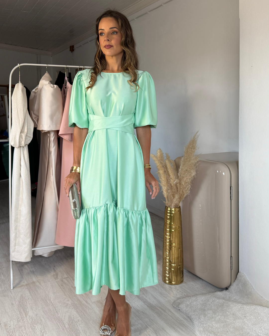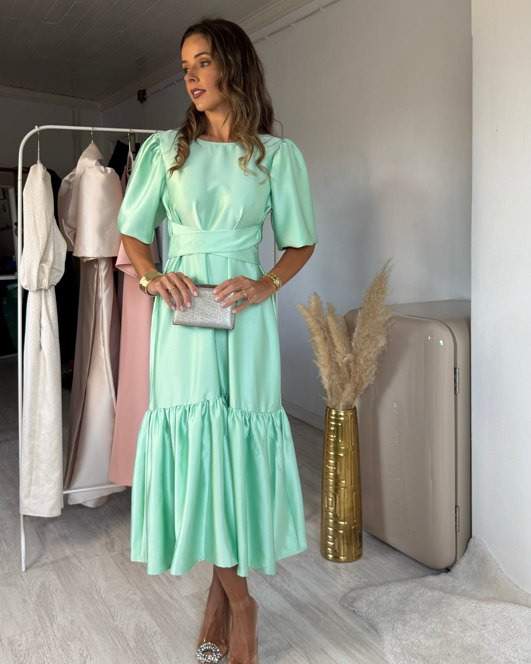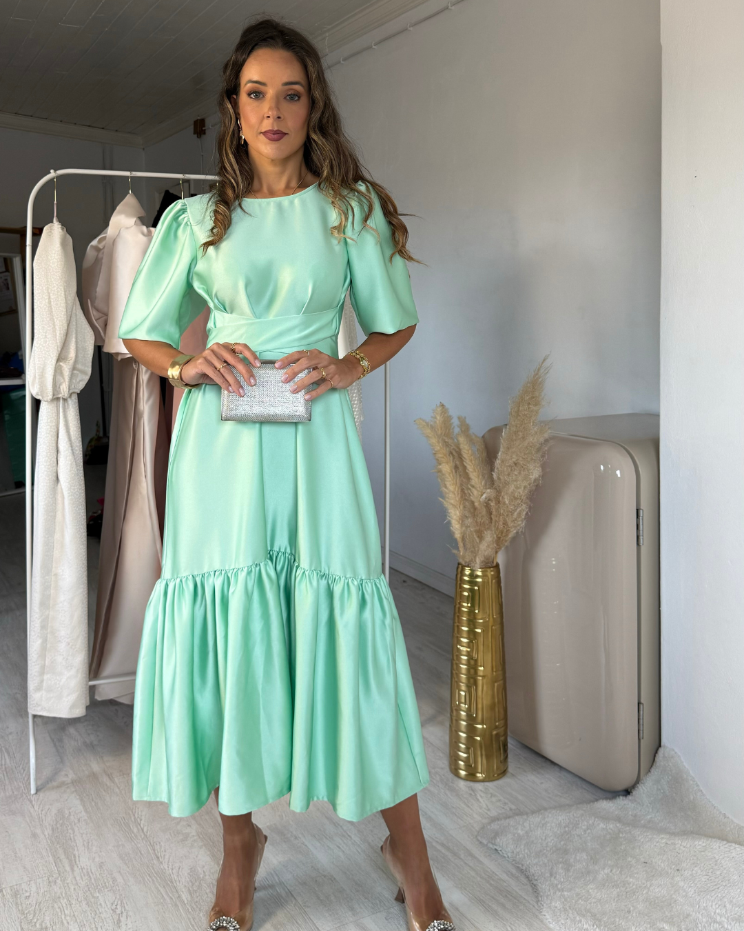 Vestido midi con volante, de escote redondo por delante y por detrás, con un ligero escote en pico en la cinturilla, que nos permite llevarlo por delante o por detrás, permitiendo así abrir el escote con facilidad. Con mangas 3/4 que terminan en elástico fruncido que nos permite llevar la versión de manga más larga o corta. Podemos utilizar al menos 8 formas diferentes, pasando por escotes, diferentes formas de llevar el cinturón/lazo y mangas. Encuentra la afirmación en tu cinturón. Levántate como las estrellas bordado en hilo de lurex.