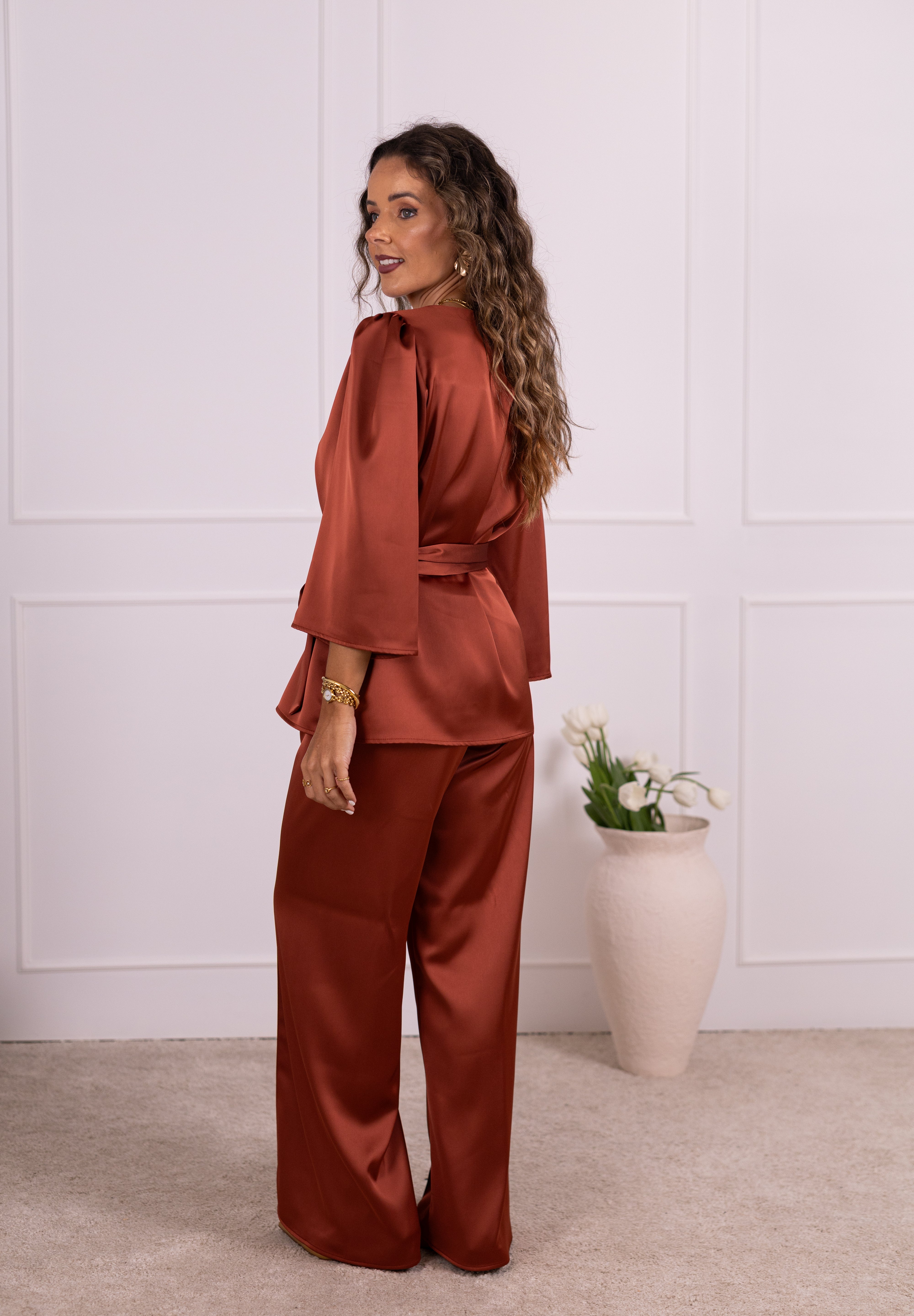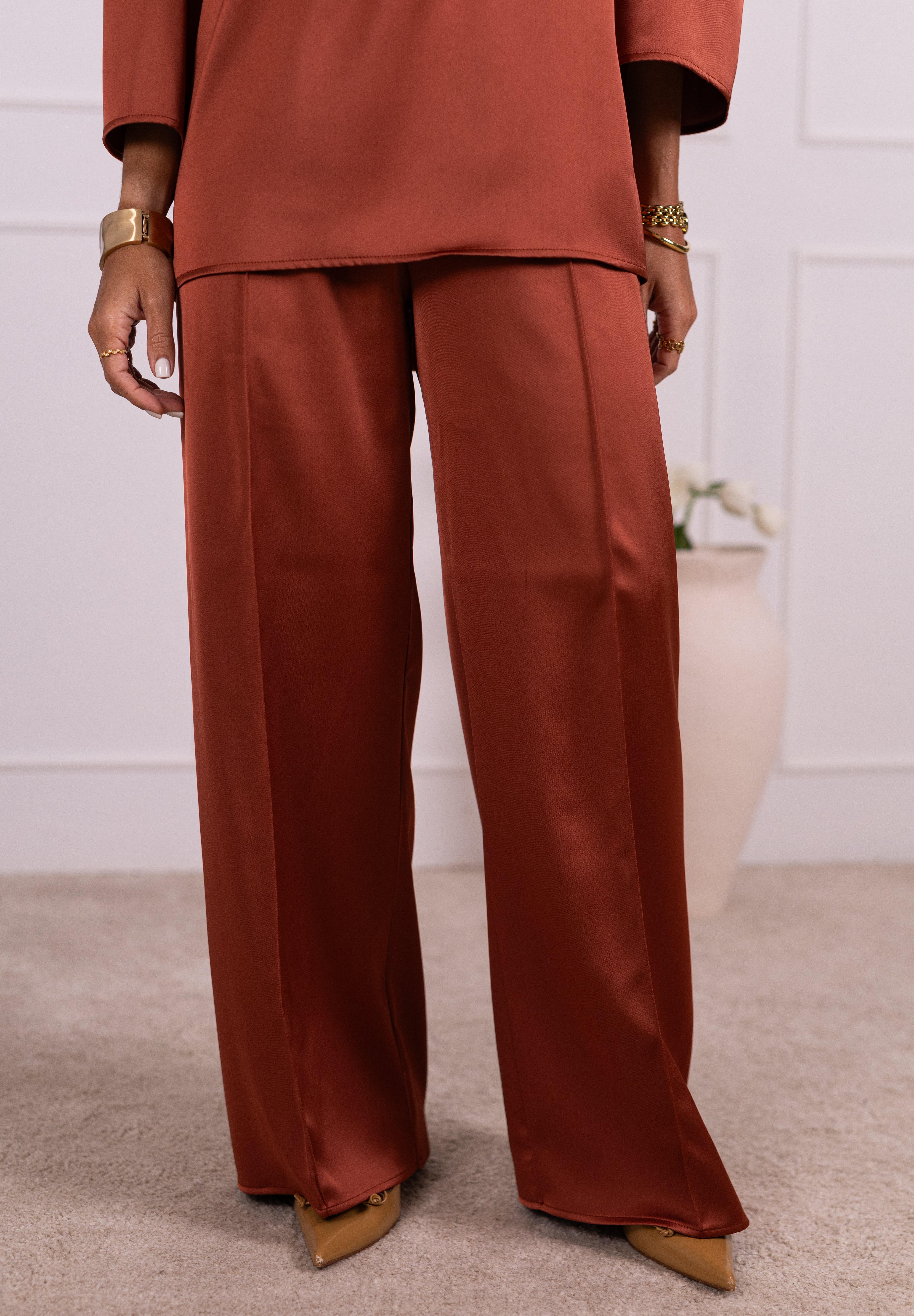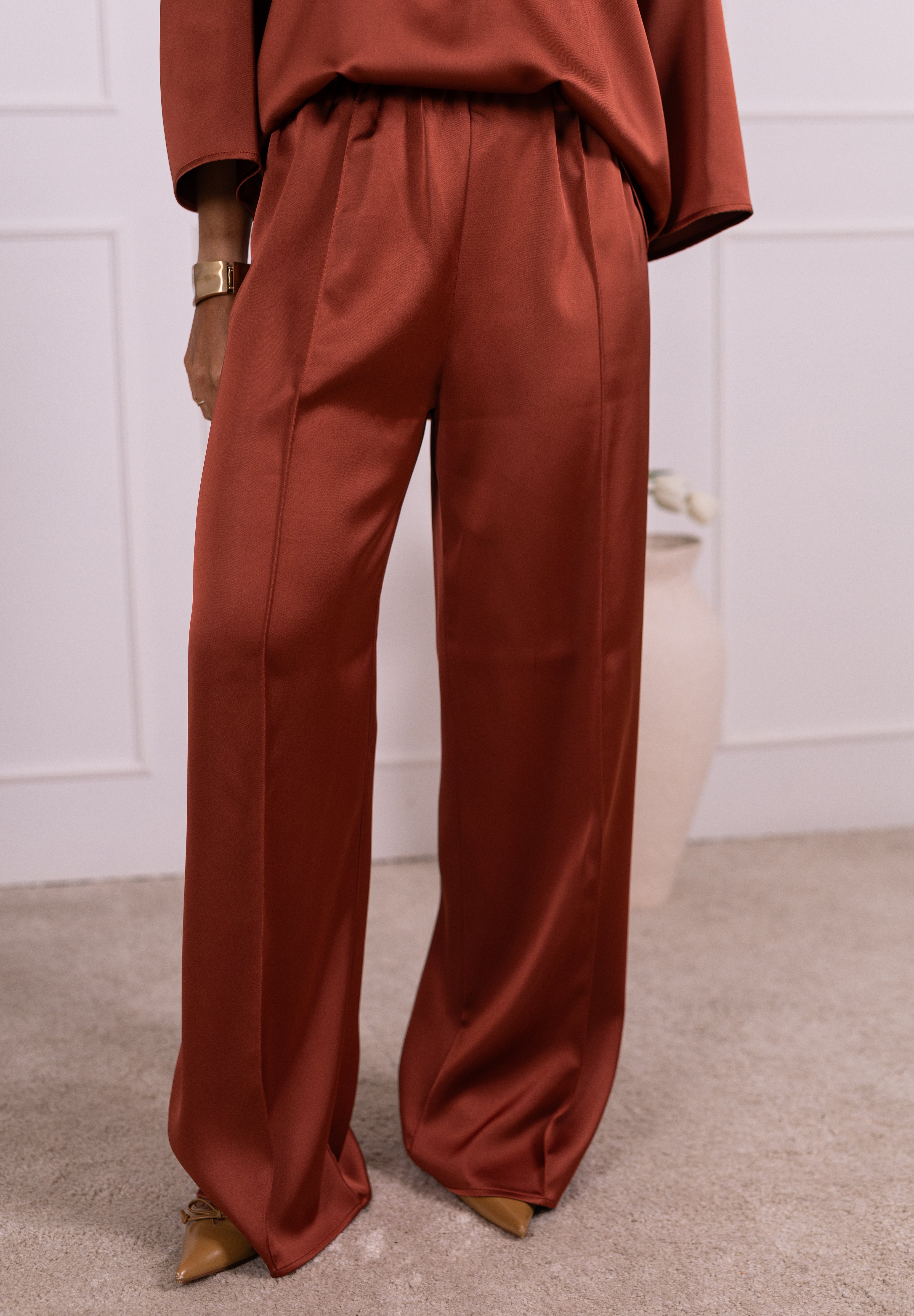 As nossas novas calças são confeccionadas em tecido acetinado, com um subtil brilho, que lhes confere sofisticação e leveza. De cintura subida, com elástico interior, adaptam-se confortavelmente a diferentes silhuetas, valorizando vários tipos de corpo. Contém o efeito de nervura que lhe atribui maior diferenciação.