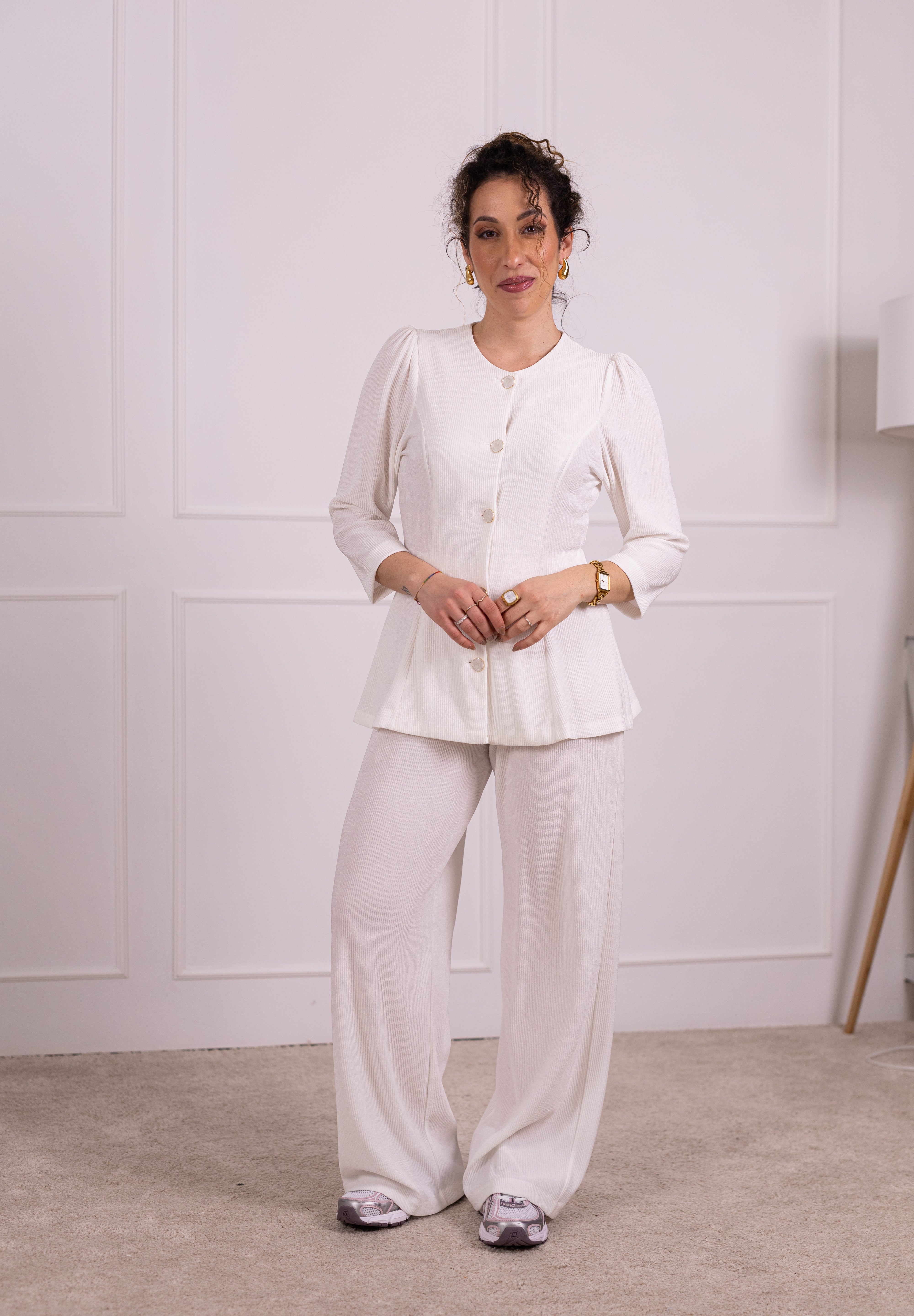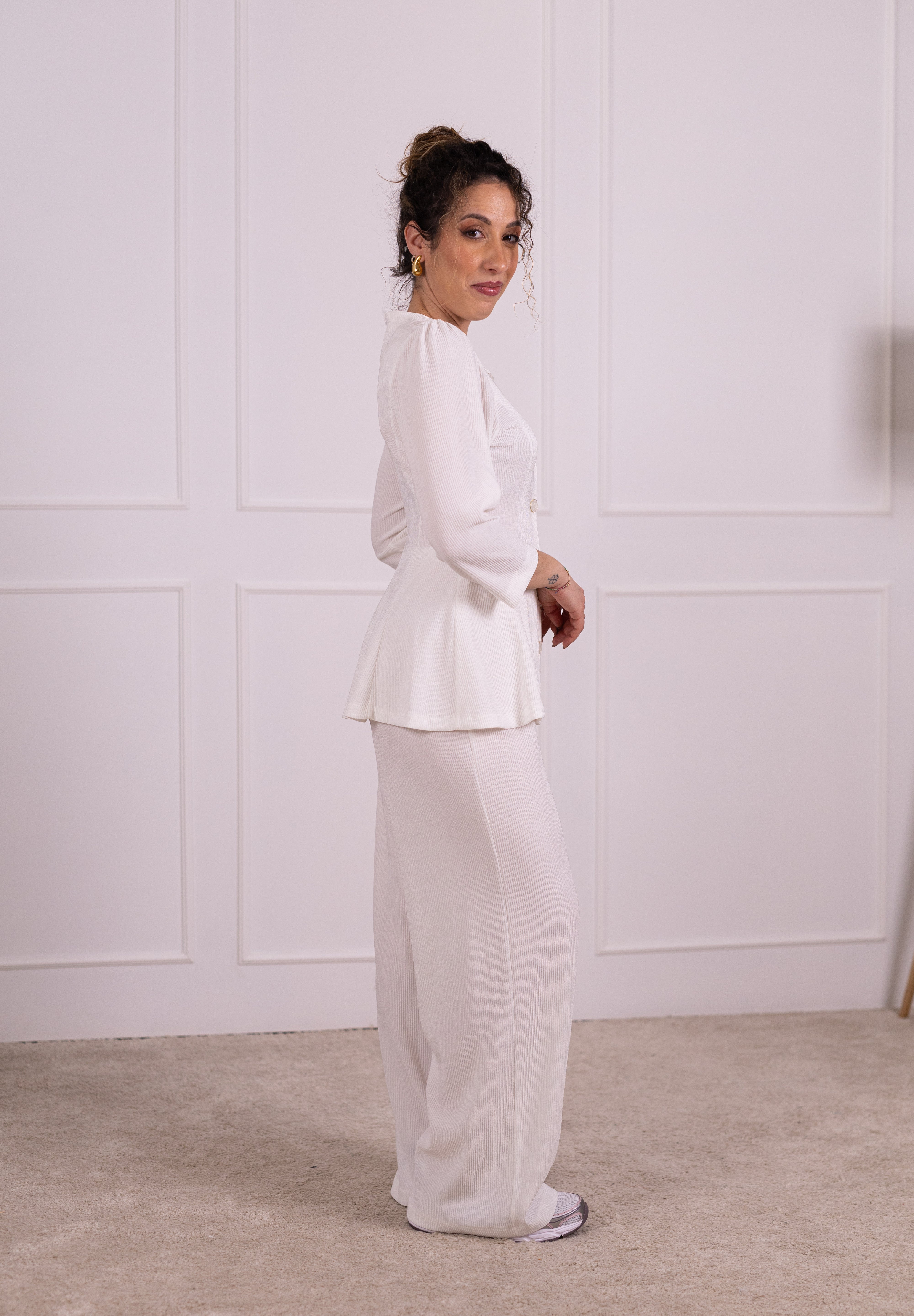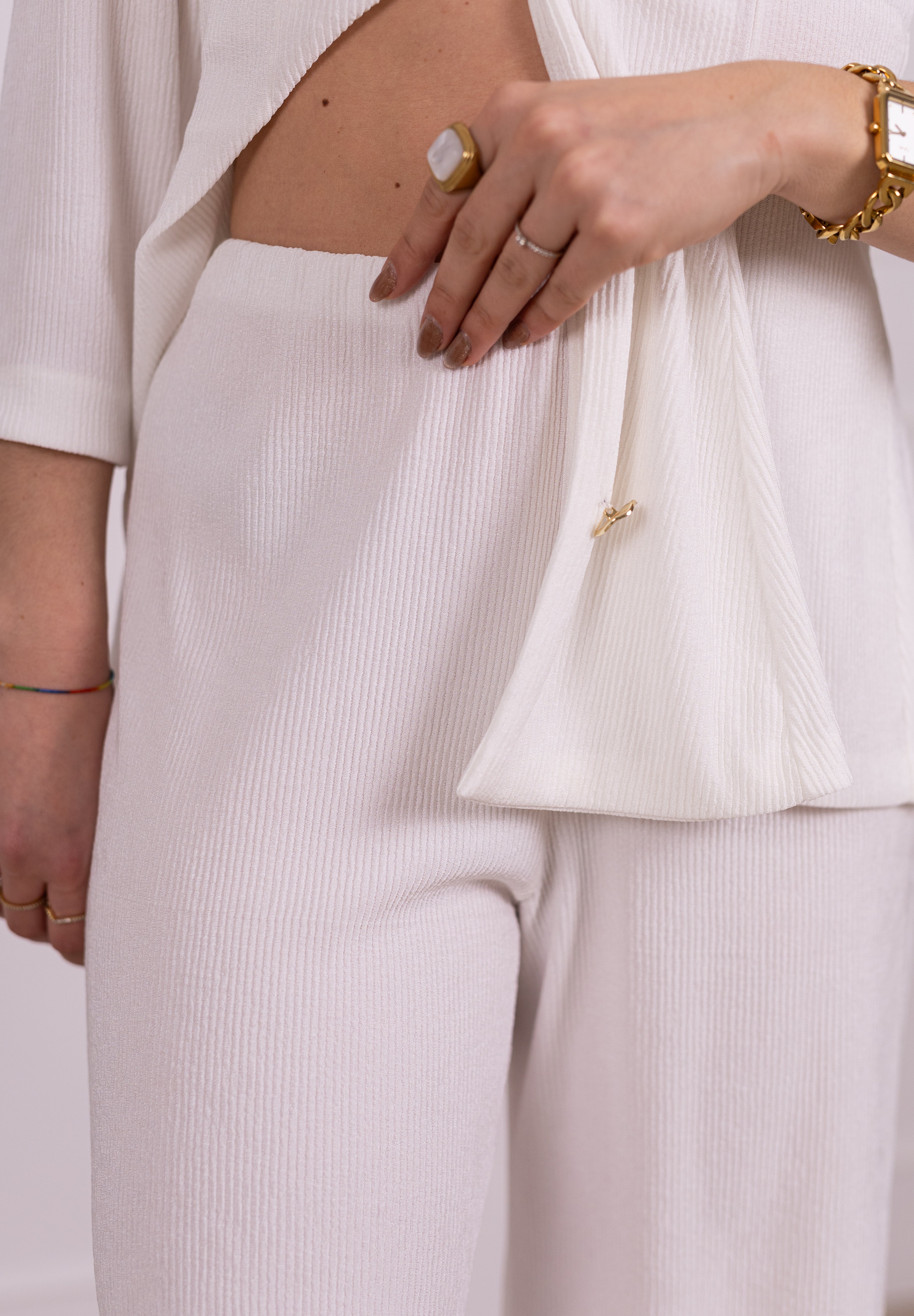 As nossas novas calças são confeccionadas em tecido plissado leve e solto, com um subtil brilho, que lhes confere sofisticação e leveza. De cintura subida, com elástico interior, adaptam-se confortavelmente a diferentes silhuetas, valorizando vários tipos de corpo. Para garantir a opacidade e o seu conforto, na cor branca as calças são forradas à cor.
