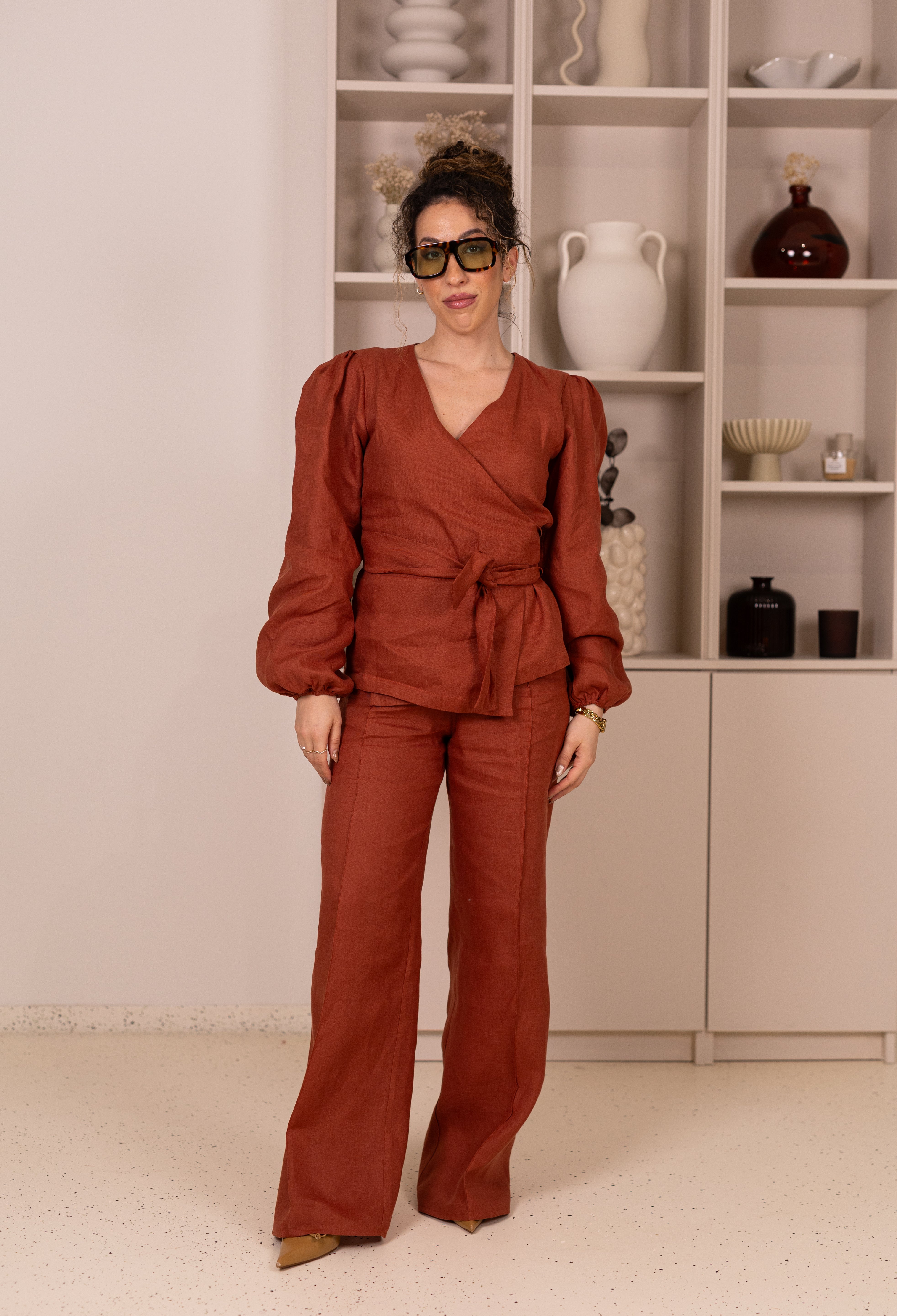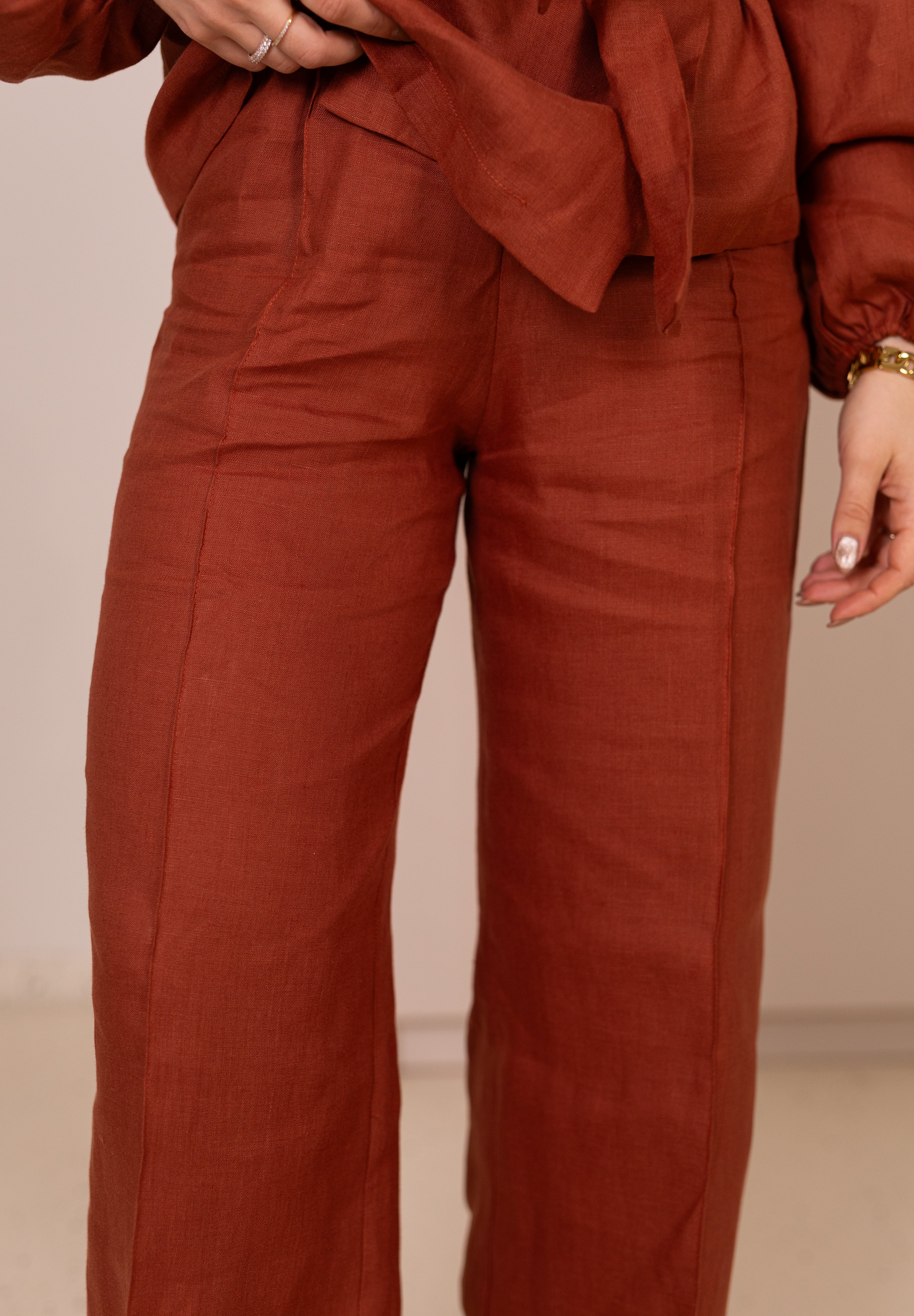 Calças de cintura subida em linho, pensadas para acompanhar o dia a dia com conforto e elegância.