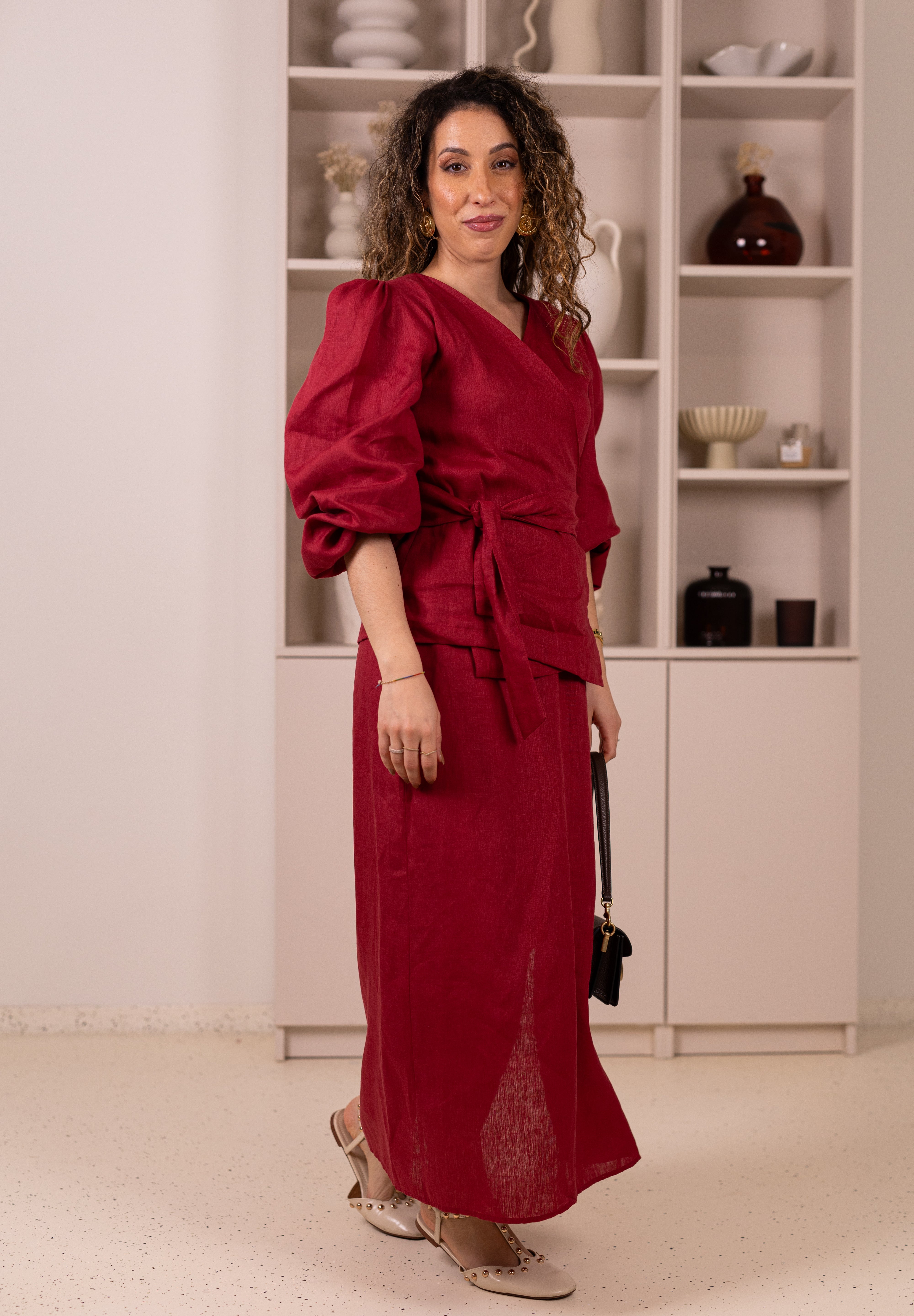Saia comprida em tecido 100% linho, pensada para acompanhar diferentes momentos, da cerimónia ao trabalho ou a um passeio descontraído.