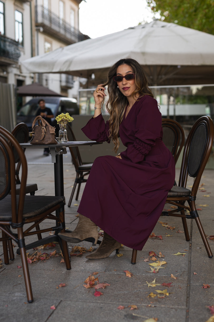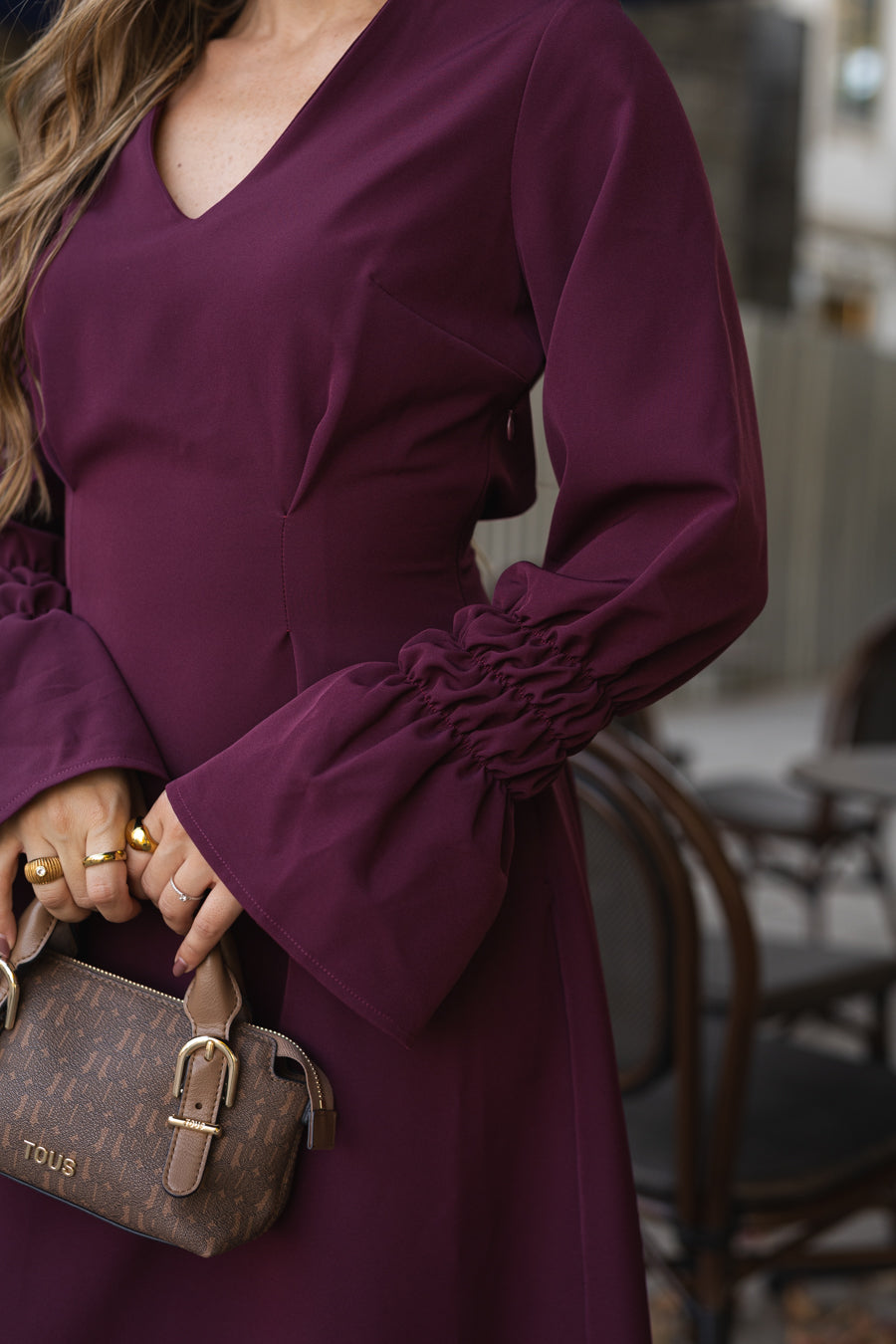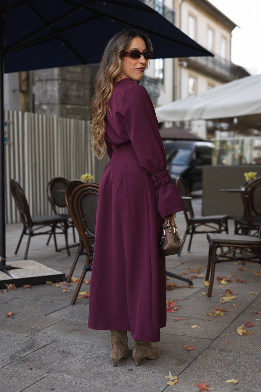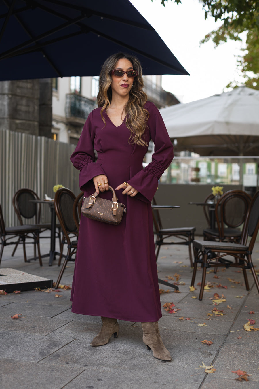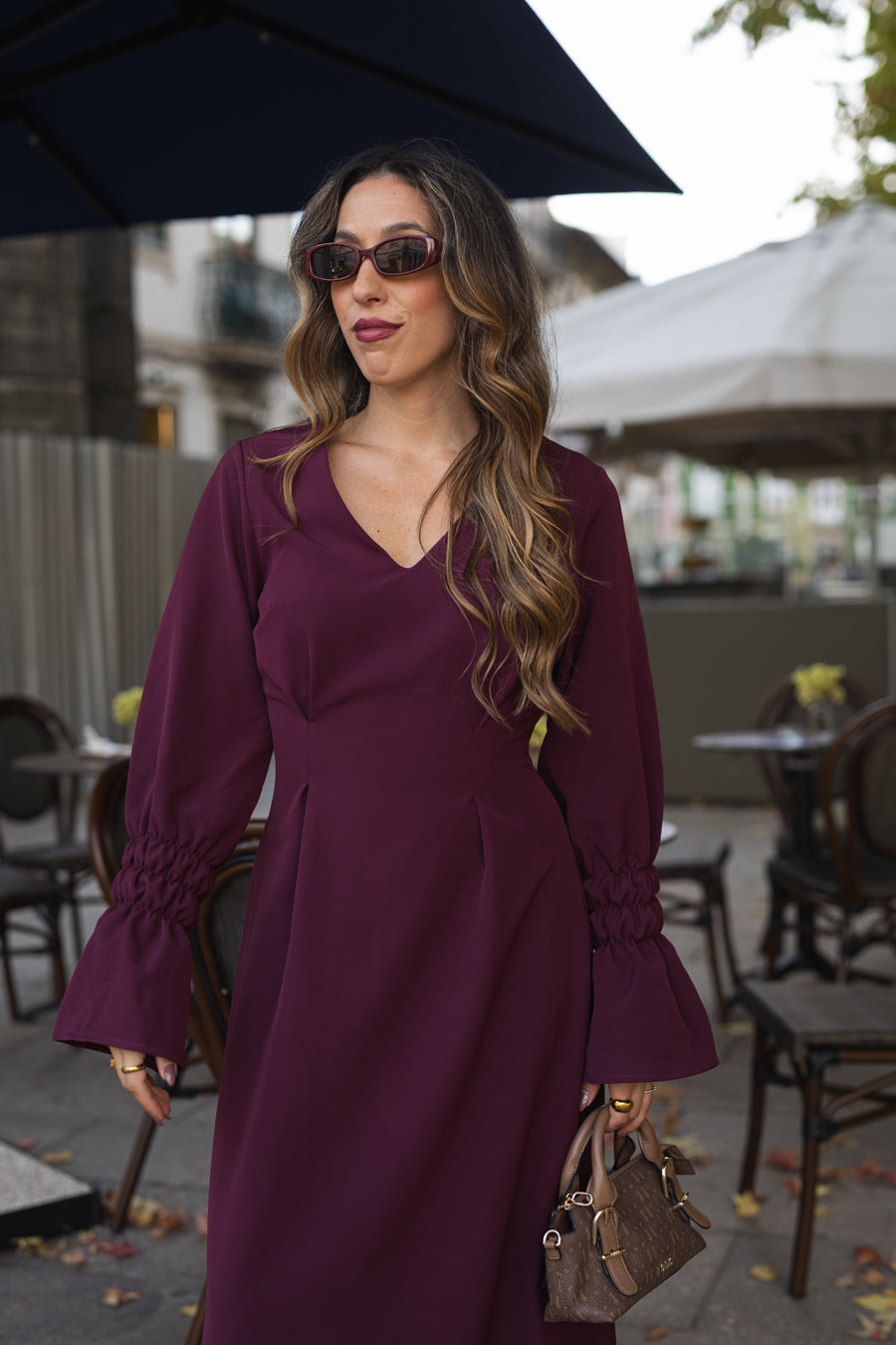 Vestido midi com efeito de pinças na frente e nas costas para uma silhueta mais cintada. Decote em V que o torna ainda mais elegante. Mangas compridas com elásticos que permite usar também mais curtas. Fecho lateral invisível na costura. Contém na manga do lado esquerdo a afirmação inspiracional bordada Be Strong.